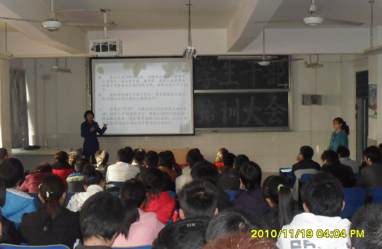 2010年11月19日下午,机电工程系团总支在2#105教室组织开展了学生干部培训班的第二次讲座,系学生会所有成员及各班级主要学生干部参加了讲座。