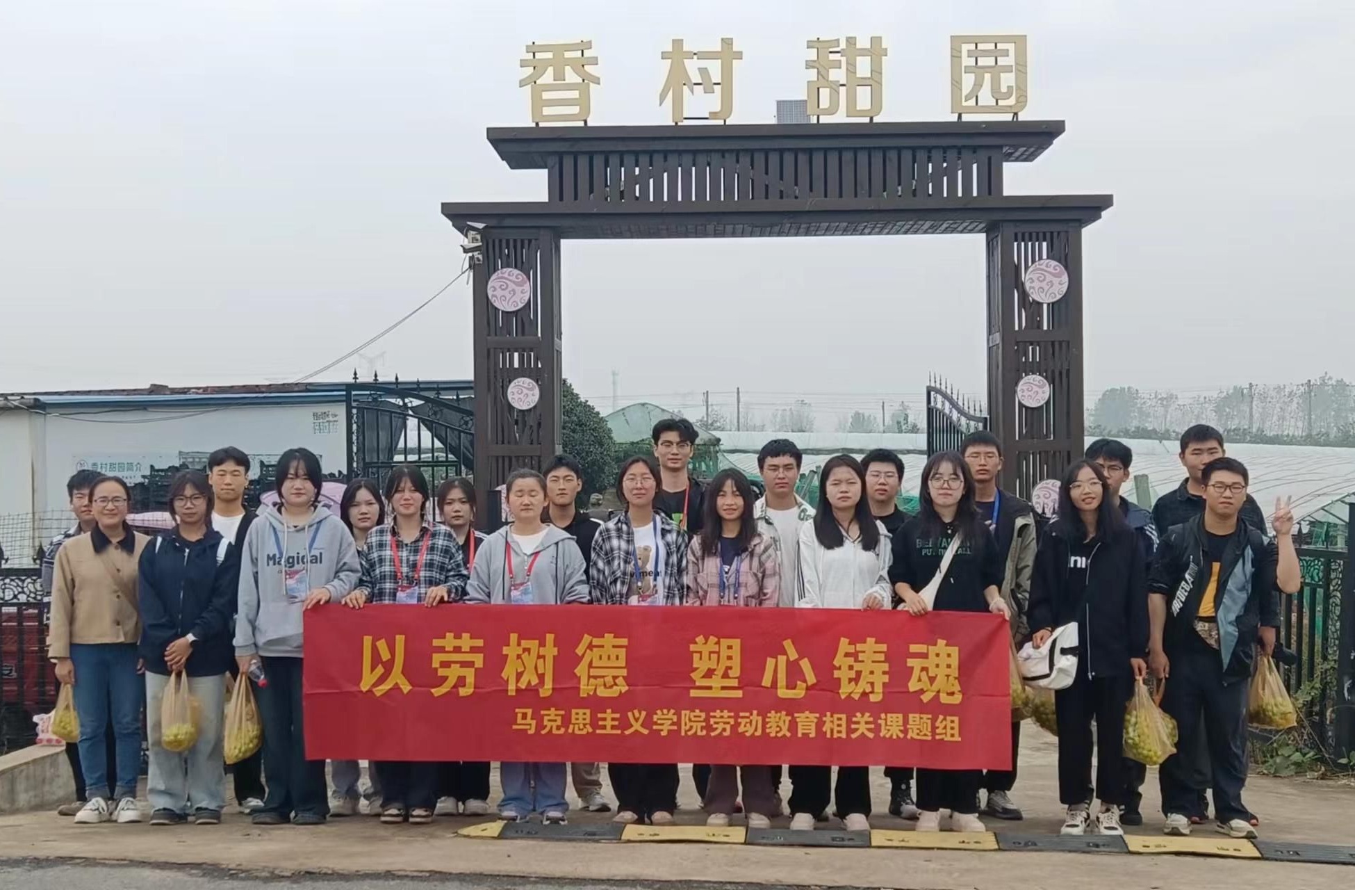 本网讯(马克思主义学院 戴柳)为帮助大学生深刻领会马克思主义劳动观,树立正确的劳动观念,懂得劳动最光荣、劳动最崇高、劳动最伟大、劳动最美丽的道理,10月13日上午,马克思主义学院戴柳老师组织21名学生代表,到六安市金安区三十铺镇乡村甜园家庭农场参加劳动教育实践活动。