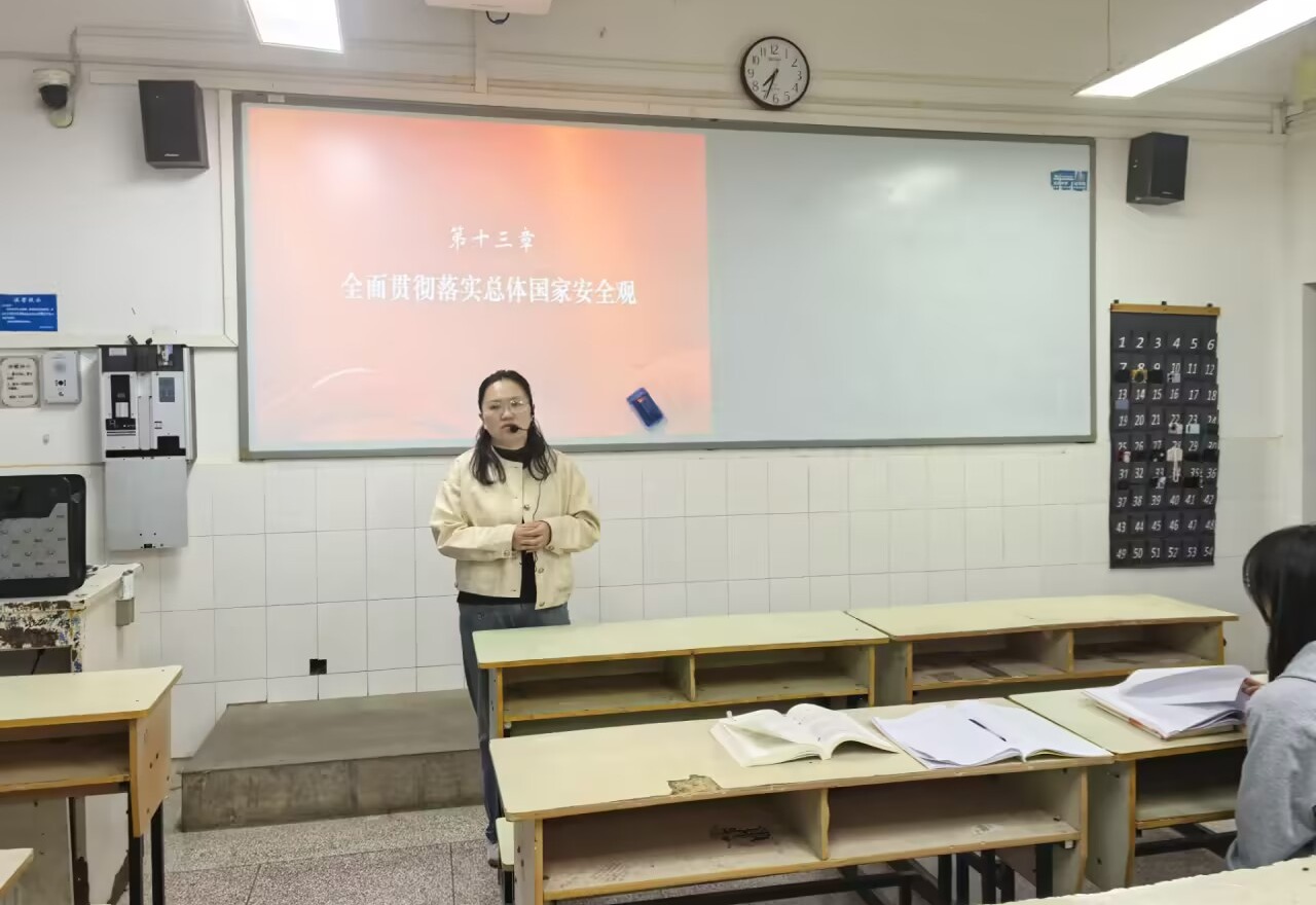 汤晓莉老师正在为学生讲授有关《全面贯彻落实总体国家安全观》的内容