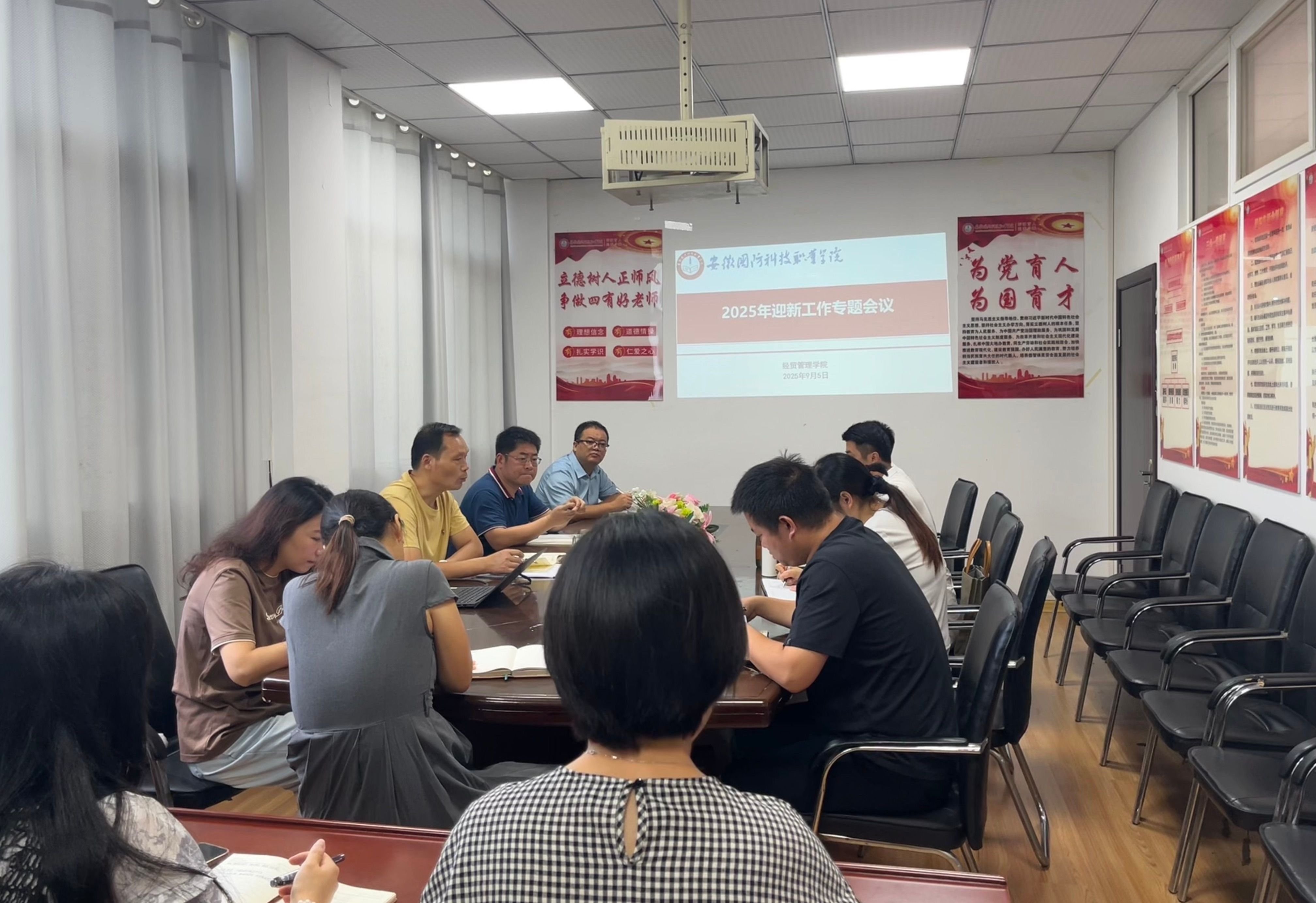 本网讯(经贸管理学院 张洋洋)为全力保障2025级新生顺利入学,切实提升迎新工作质量与服务水平,9月5日上午,经贸管理学院组织召开2025年迎新工作专题会。会议由院党总支书记刘峰主持,学院院长杨力、副院长杨学分及迎新工作组全体成员参会。
