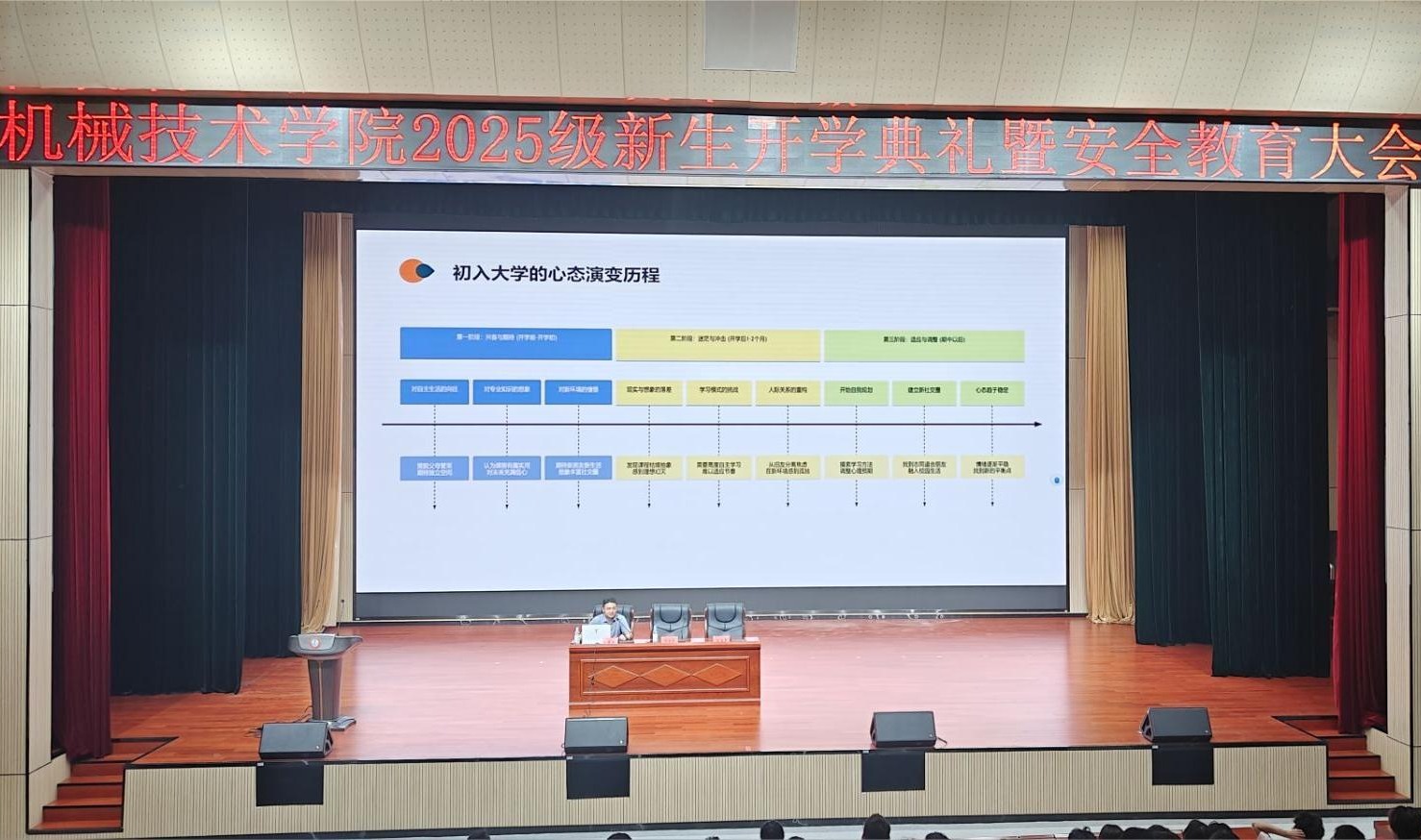本网讯(机械技术学院 柏媛媛)九月芳华,秋意渐浓。9月11日下午,在产教融合中心多功能报告厅,机械技术学院2025级新生开学典礼暨安全教育大会隆重举行。学院党总支副书记张红军、学院副院长熊良平、联德精密材料(中国)股份有限公司人力资源部部长康士杰、团总支书记王腾州,各专业带头人、专兼职辅导员和教师代表,近700余名师生共聚一堂,共迎新篇章。