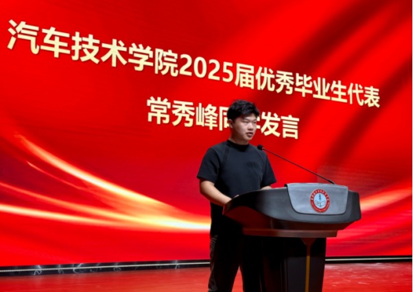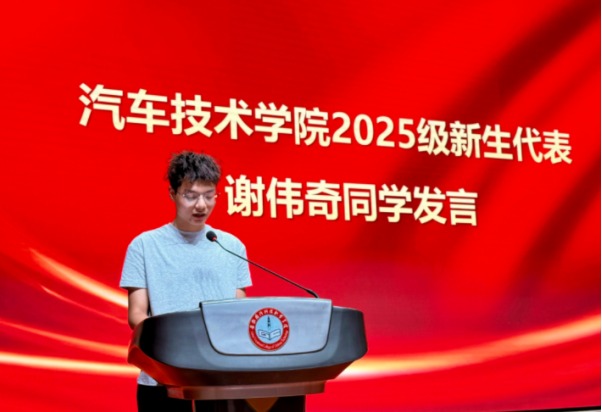 新生代表谢伟奇表达了对大学生活的憧憬和期待,承诺将以饱满的热情投入到学习中,严格要求自己,努力学习专业知识,积极参加各项活动,与同学们携手共进,在汽车技术学院这片沃土上追逐梦想,不负青春。