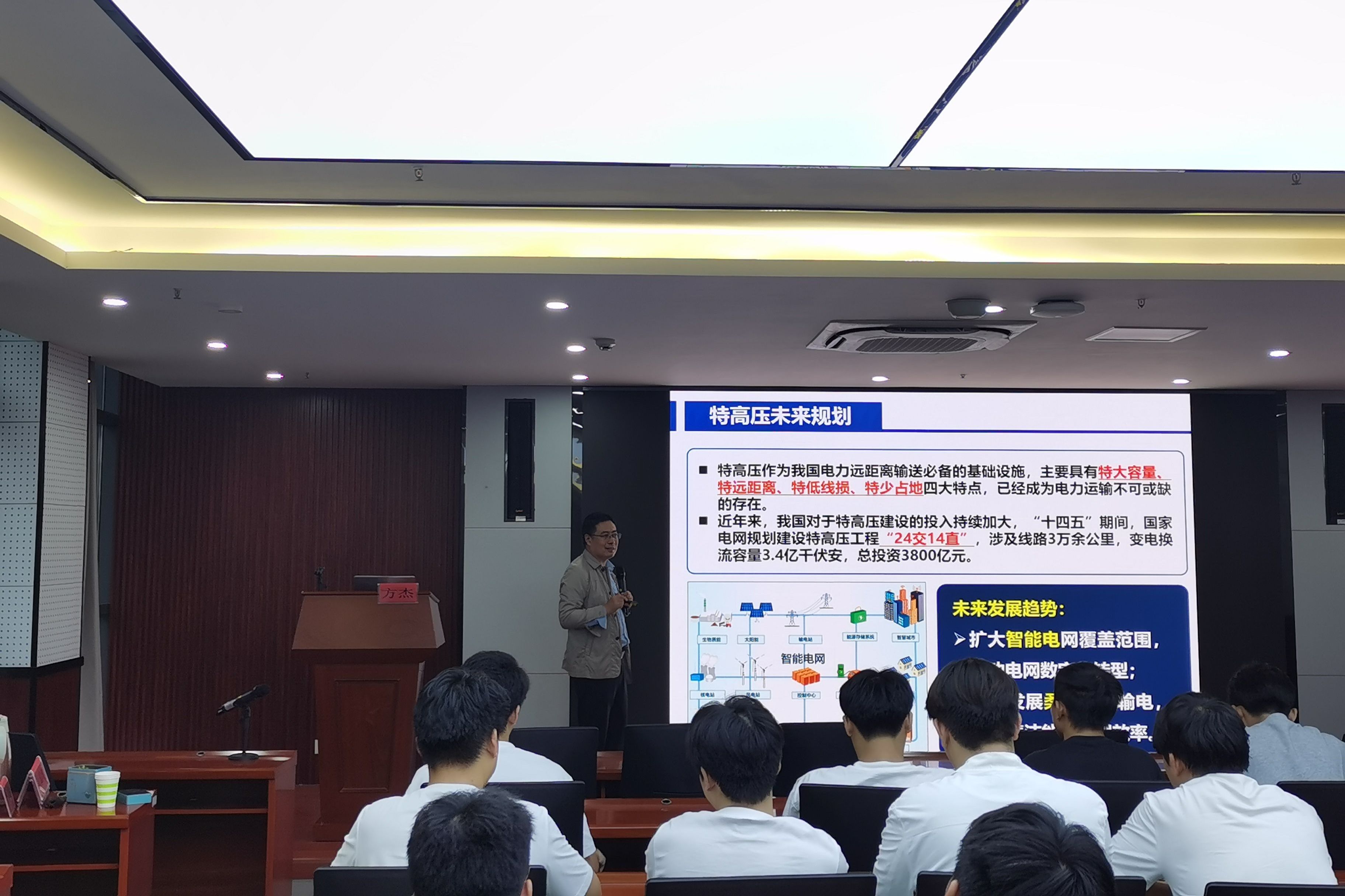 在专业解读环节,方杰深入剖析电气工程学科内涵,并介绍了电气工程及其自动化专业的发展沿革,明确电机学、电力电子技术等核心课程。他结合安徽电力工业发展实例——从佛子岭水电站的历史贡献到 “皖电东送”特高压工程的战略意义,生动展现了专业在实际产业中的重要价值。