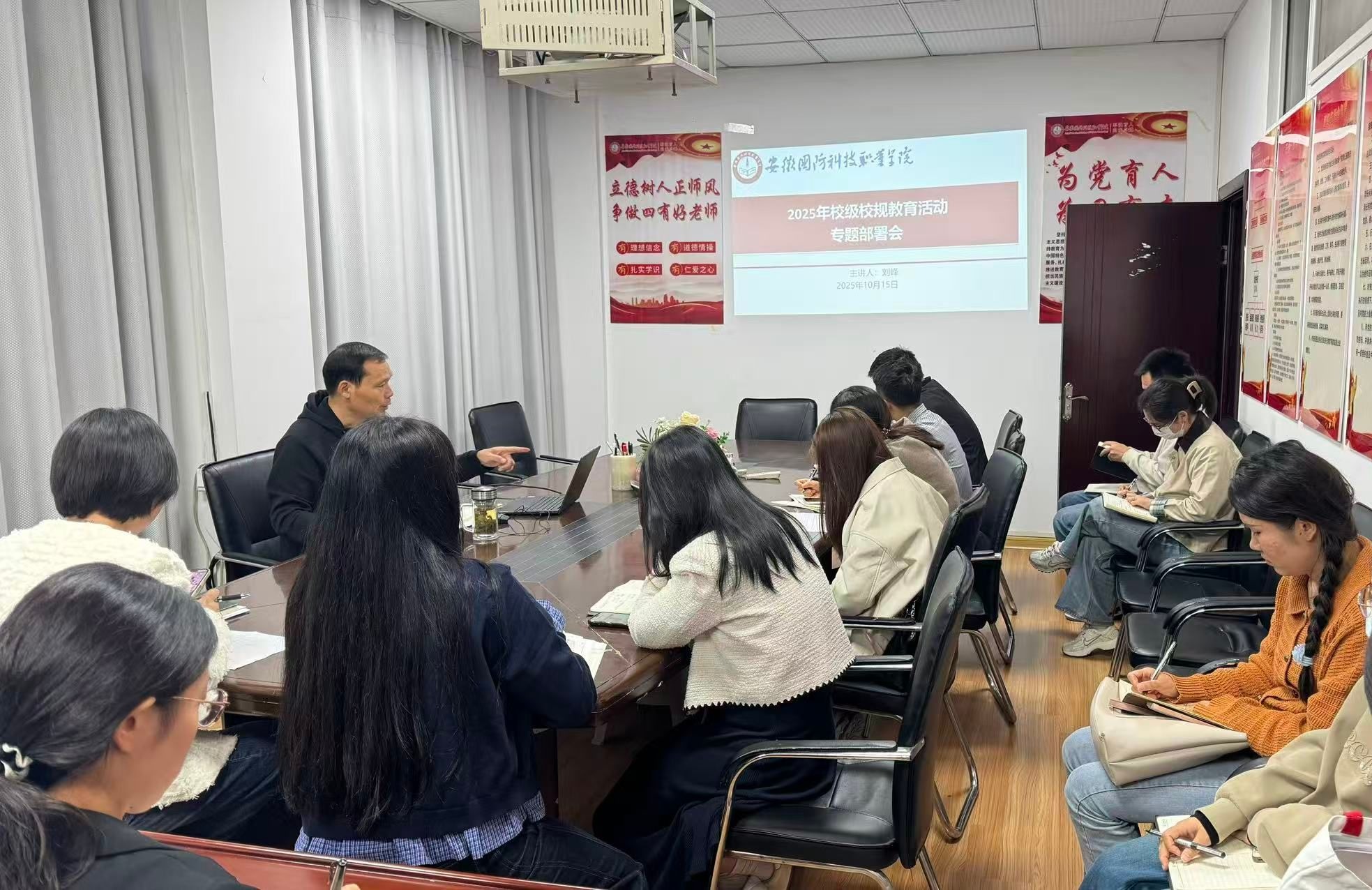 本网讯(经贸管理学院 刘星怡)为深入贯彻落实《关于开展2025年校纪校规教育活动的通知》精神,全面推进校纪校规教育活动落地见效,切实增强学生规则意识与安全观念,10月15日下午,经贸管理学院党总支书记刘峰主持召开专题会议部署2025年校纪校规教育活动,学院全体辅导员参加会议。