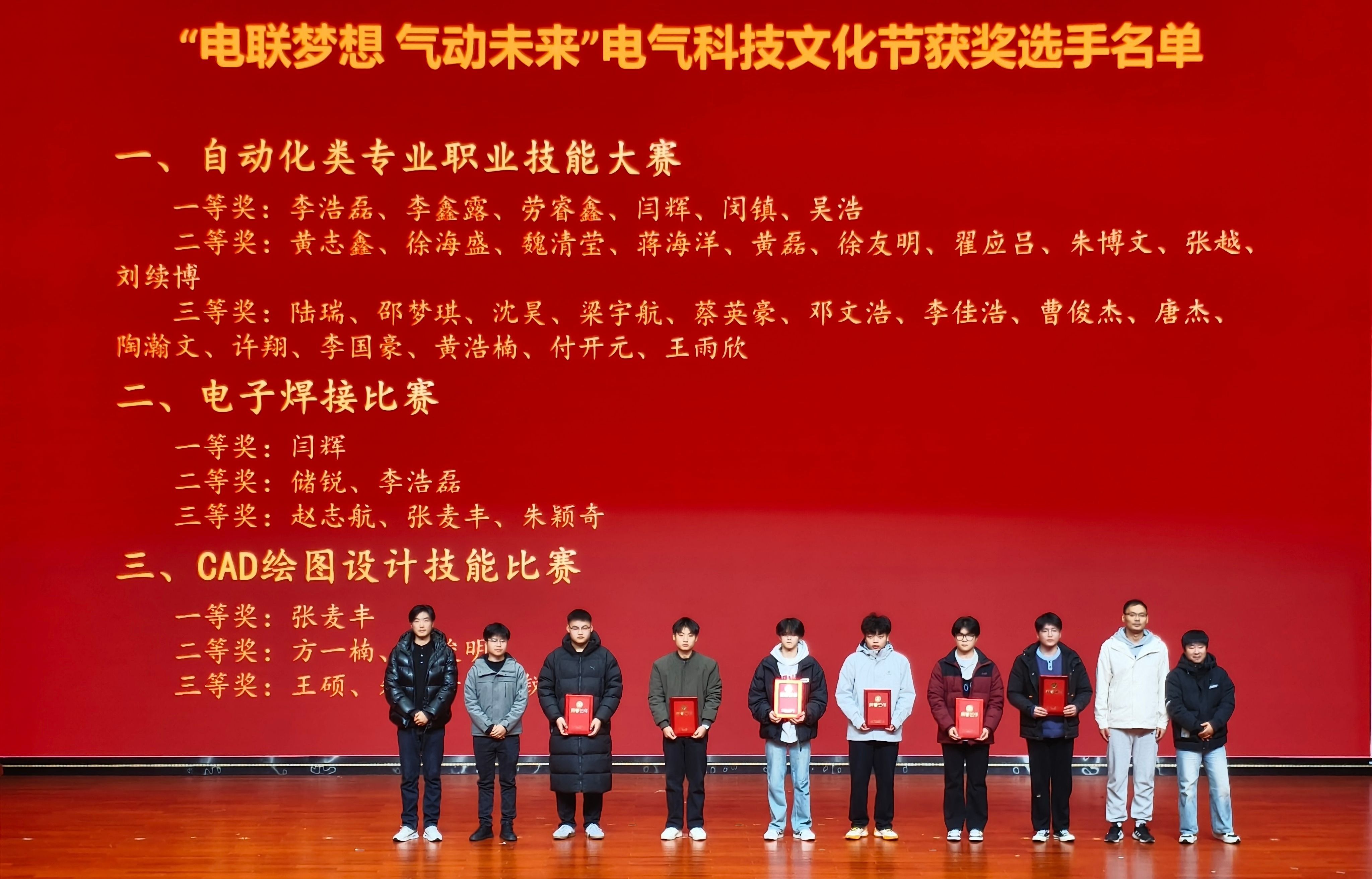 本网讯(电气技术学院 陈俊)为深入贯彻“以赛促学、以文化人”的育人理念,全面展示我院学子在专业技能、科技创新与综合素质方面的丰硕成果,充分发挥先进典型的示范引领作用,营造积极向上、追求卓越的校园文化氛围,我院于12月11日晚在校多功能报告厅隆重举行电气科技文化节闭幕式暨2024-2025学年优秀学生表彰大会。学院党总支副书记、团总支书记、全体专职辅导员及300余名学生代表齐聚一堂,共同见证这场融汇科技探索、文化传承与青春荣耀的年度盛事。