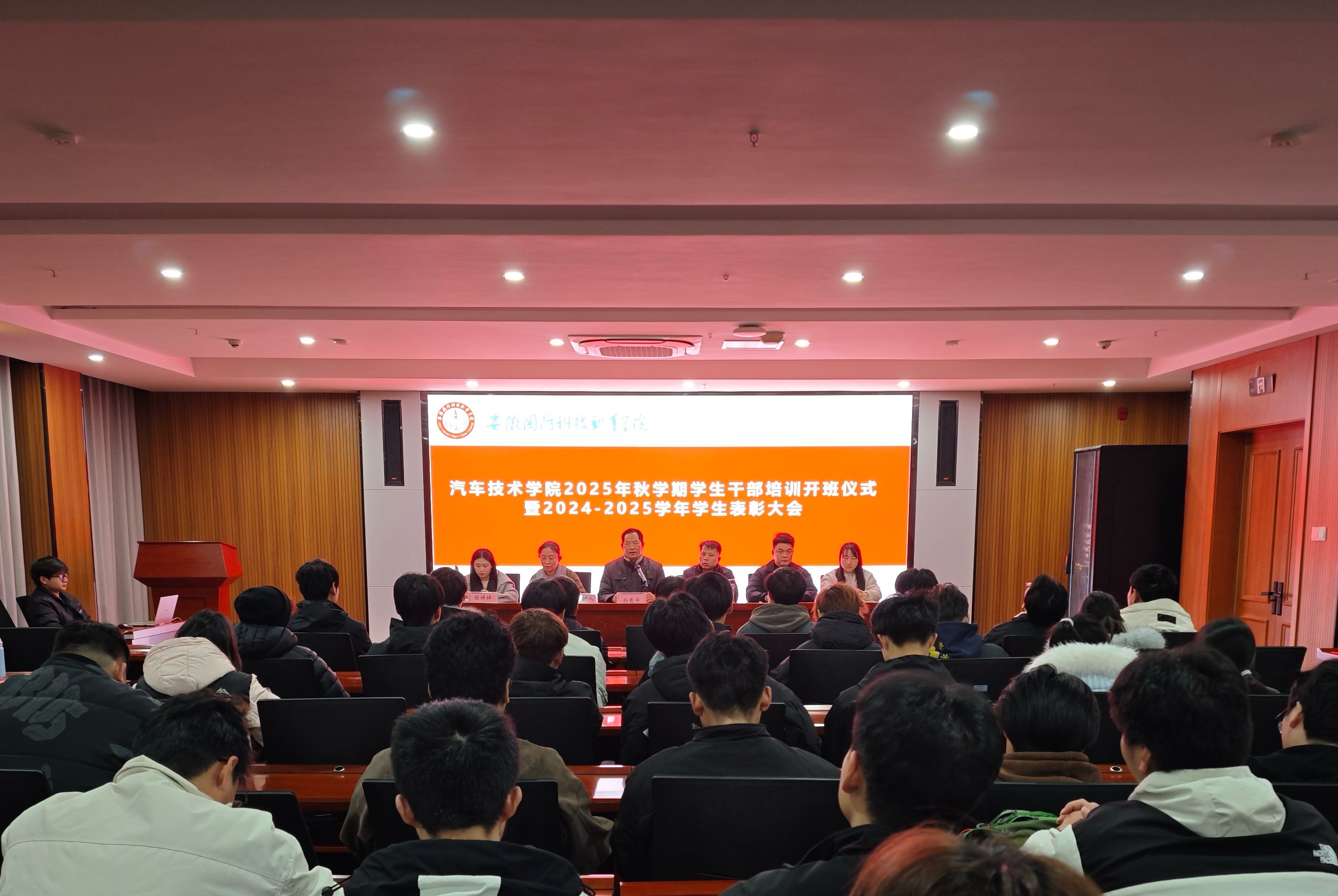 本网讯(汽车技术学院 徐婷婷)为提升学生干部综合素质,增强自我教育、自我管理、自我服务的意识,进一步激励广大学子展现青春作为、彰显青春风采、贡献青春力量,根据《关于开展汽车技术学院2025年下半年学生干部培训班的通知》文件要求,汽车技术学院于12月12日下午在产教融合第一报告厅开展2025年秋季学生干部培训暨2024-2025学年优秀学生表彰大会,汽车技术学院党总支书记孙良平、副院长(主持工作)姜继文、党总支副书记陈梦雅、团总支书记徐婷婷及辅导员张洋洋、熊美艳出席会议,院团总支委员、学生会、挂靠社团学生干部及各班级学生干部代表参加大会。