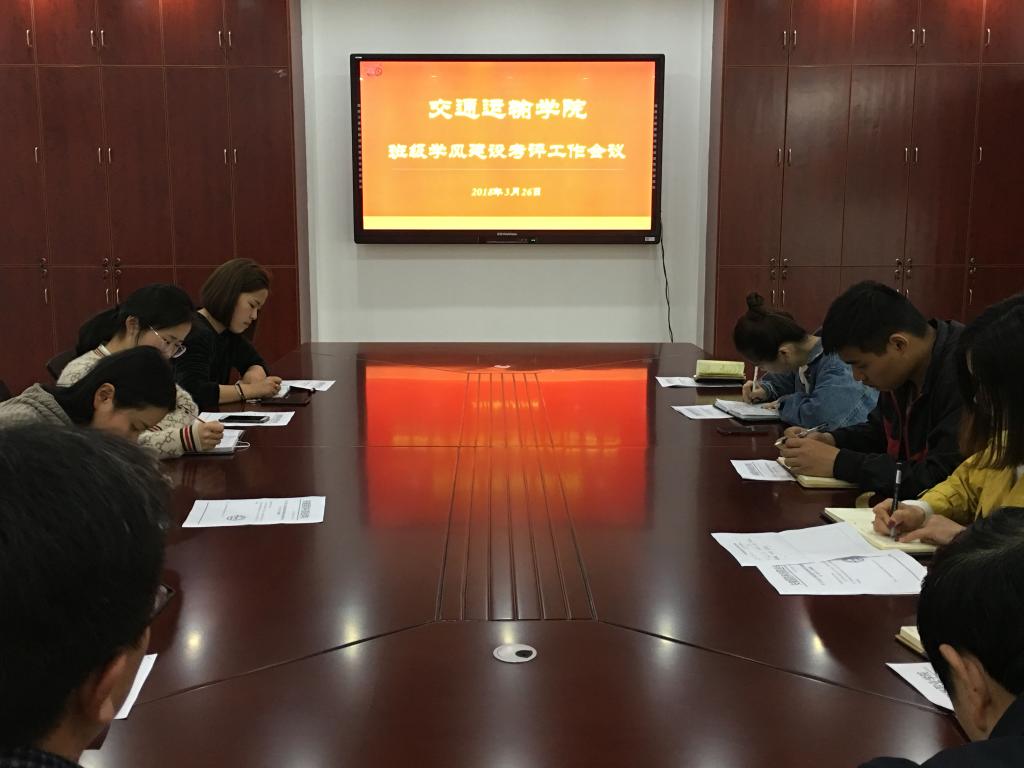 本网讯(经贸管理学院 吴平)为保证班级学风建设考评工作常态化,推进班级学风建设,2018年3月27日下午,交通运输学院在实训楼4楼经贸学院会议室召开班级学风建设考评工作会议。出席本次会议的有中航国铁(北京)教育投资有限公司安徽分公司吴文斌主任、交通运输学院教学部李建新主任、学工部胡晏平主任、各班级辅导员及班主任老师。