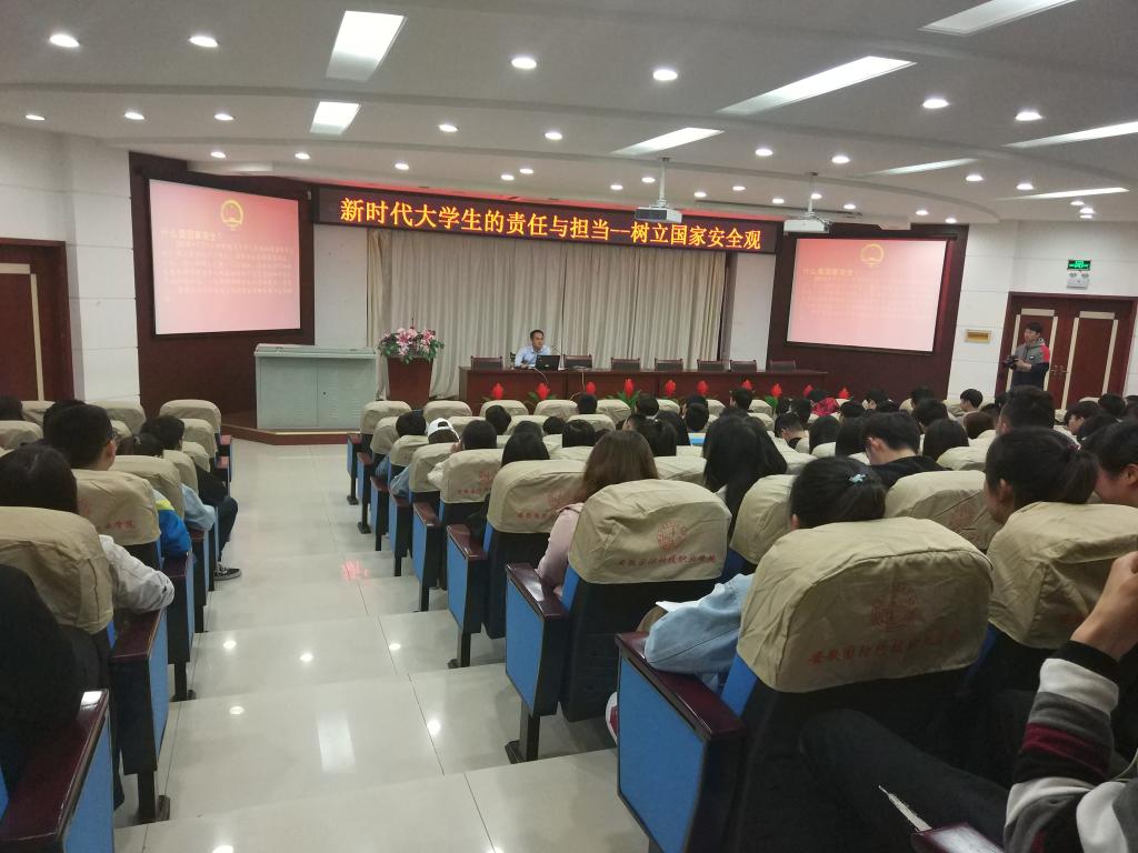 张警官强调了提高全民国家安全意识的重要性,从国家安全的内涵、我国当前面临的安全形势、国家安全机关职业任务、防范和抵御“颜色革命”和大学生日常行为规范等方面给参会的师生详细讲述了国家安全教育的意义。张警官指出,新时代大学生的国家安全意识急需加强,要构建学校、社会、家庭三位一体的国家安全教育体系。结合高校实际,国家安全工作要“立起来、活起来、实起来”,要深化国家安全意识,国家安全教育要与课程教育深度融合,运用多样化的教育模式把国家安全教育工作做出特色,入脑入心。并穿插了利用高校学生危害国家安全的案例,让与会师生更加直观的了解防谍反恐的重要性和紧迫性,树立总体国家安全观,巩固和增强维护国家安全人人有责的意识。