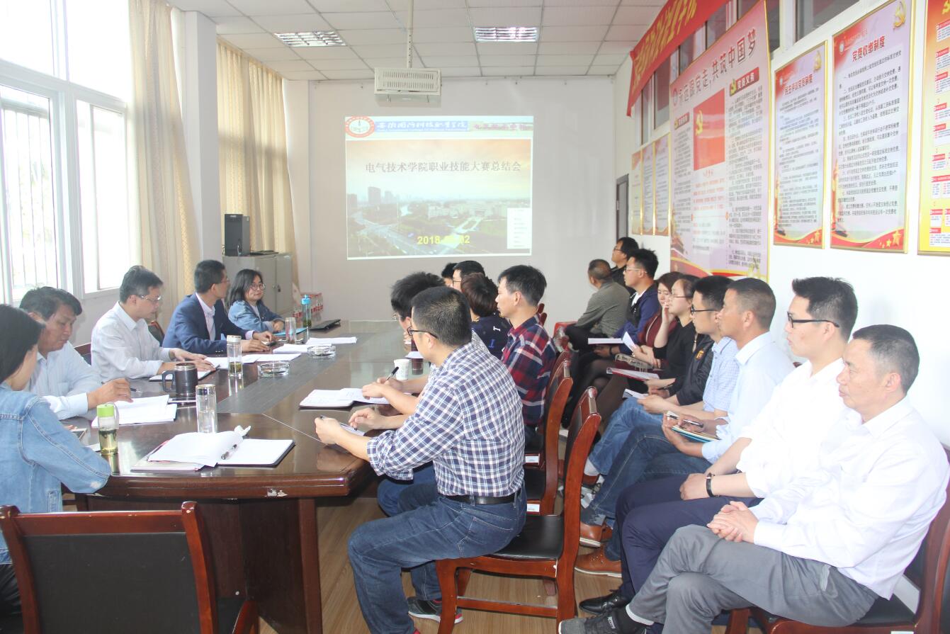本网讯(电气技术学院 江治国)5月3日下午,电气技术学院在会议室召开2018年省职业技能大赛总结交流会,全体参赛指导教师及相关教师参加了会议,会议由院长李翔主持。李翔院长首先公布了2018年学院组队参赛的各赛项获奖情况,向全体指导教师表达了祝贺,同时也对指出了部分赛项中出现的问题,要求大家认真总结经验教训,要充分发挥“以赛促教、以赛促改、以赛促学”的竞赛引领机制,通过职业技能竞赛活动不断优化教育教学改革,加强学院专业内涵建设,坚持工学结合、知行合一,全面提高技术技能人才培养质量,真正培养出一批会学习、会动脑、能动手、有创新的学生。