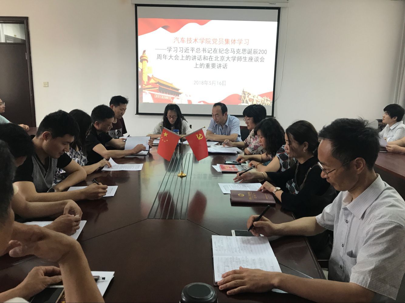 本网讯(汽车技术学院 朱其阳)按照学校2018年党员职工学习教育计划的要求,5月16日下午15:00,汽车技术学院在行政楼416会议室开展党员教职集体学习活动。会议由汽车技术学院党总支书记殷世江主持。汽车技术学院办公室主任兼组织员刘严和第二党支部书记朱其阳分别带领大家认真学习习近平总书记在纪念马克思诞辰200周年大会上的讲话精神和习近平总书记在北京大学师生座谈会上的重要讲话精神。