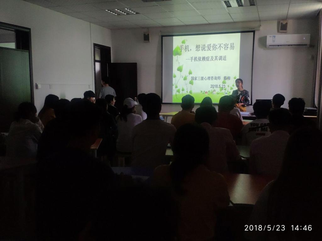 本网讯(思政部 周晓梅)根据第十三届大学生心理健康节活动安排,心理健康教育中心于5月23日下午在行政楼508团体训练室举办了“我爱我”心理讲堂,此次心理讲堂邀请了汽车技术学院心理辅导员、国家三级心理咨询师戴柳担任主讲,讲座主题为《手机,想说爱你不容易——手机依赖症及其调适》,2017级全体班级心理委员参加了讲座。