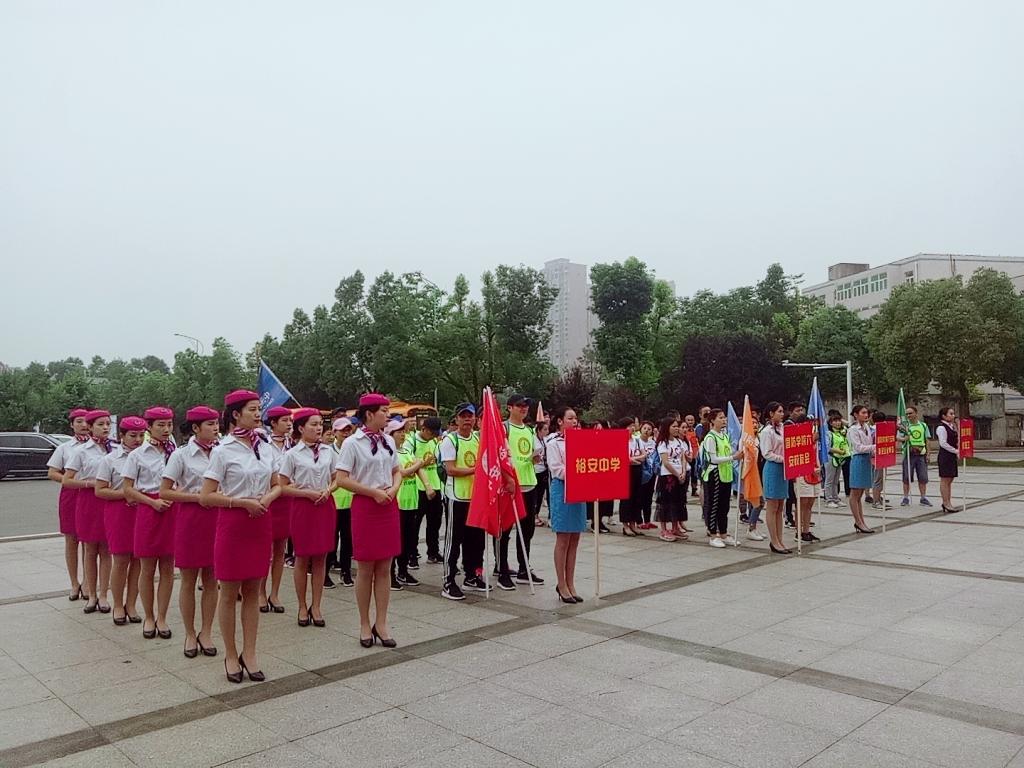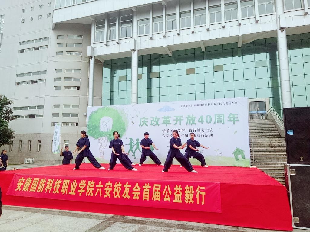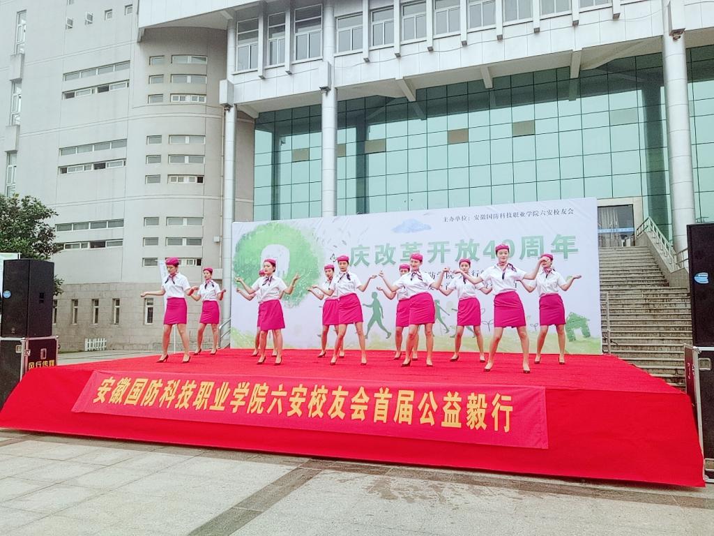 本网讯(经贸管理学院 阮露)情系国防学院,怡行魅力六安,beat365唯一官方网站六安校友会首届公益毅行活动于5月27日早在学校书馆门前开幕,交通运输学院空中乘务和城市轨道交通运营管理专业共30名学生为本次活动做志愿者服务以及节目表演。