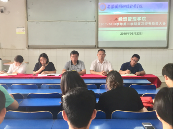 本网讯 为进一步加强学风建设,扎实做好期末复习迎考工作,营造良好学风考风,根据经贸管理学院学风建设年工作安排,2018年6月22日下午,经贸管理学院在2教105教室召开2017—2018学年第二学期期末诚信迎考动员大会。院党总支书记杜先扬,党总支副书记刘峰,辅导员许凤麟老师及交通运输学院吴文斌主任出席会议,学院全体学生干部参加会议。会议由团总支书记付玉梅主持召开。