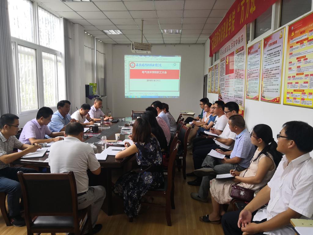 本网讯(电气技术学院 史媛芳)学期伊始,为确保新学期各项工作顺利开展,9月1日上午9点,电气技术学院召开了2018-2019第一学期开学首次教职工大会,部署安排开学工作等事宜。会议由学院党总支书记王希江主持,全体教职工参会。