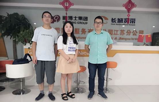 调研组看望2017届毕业生高桂清(中)、2014届毕业生贺剑(右)(长城宽带)