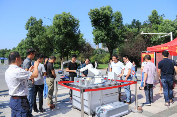 (给学生和家长展示工业机器人设备)