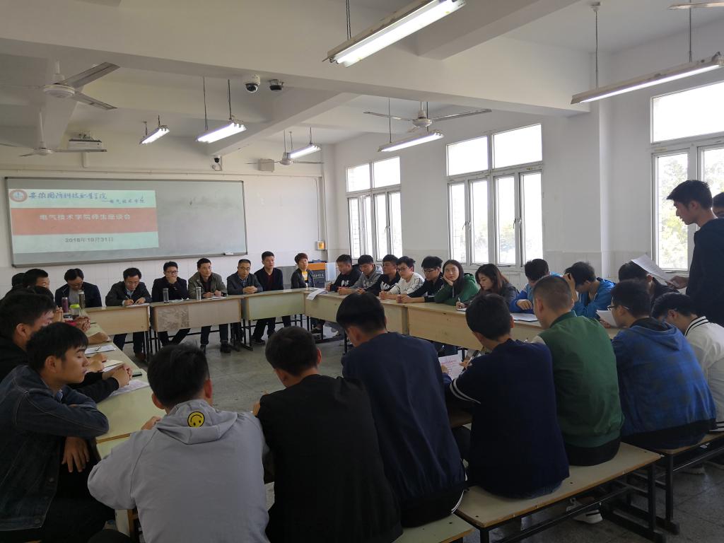 本网讯(电气技术学院 程坤)为提高教学管理服务水平和教学质量,更好地加强学生与教师之间的交流和沟通,进一步密切师生情感,根据电气技术学院教学督导组的学期工作安排,学院于10月31日下午组织召开了2018-2019学年第一学期师生座谈会。座谈会按年级分成两个组,分别在2教307、308教室同时进行,由电气技术学院副院长侯国栋、党总支副书记罗威分别主持,所有专业课授课老师及各专业班级的学生代表参加了会议。