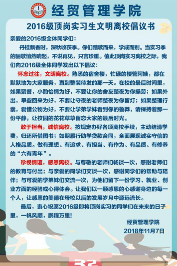 为做好2016级顶岗实习学生文明离校工作,经贸管理学院通过张贴海报、微信公众号、主题班会等途径发出《2016级顶岗实习生文明离校倡议书》,引导同学们文明离校、诚信离校、感恩离校。