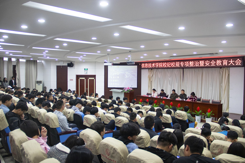 本网讯(信息技术学院 马士君)为深入贯彻落实《beat365唯一官方网站校纪校规专项整治活动实施方案》文件精神,进一步增强学院学生的组织纪律观念和安全意识,规范学生日常行为,强化学生安全教育,11月7日下午15:30,信息技术学院在图书馆报告厅组织召开了校纪校规专项整治暨安全教育大会。学校党委委员、信息技术学院院长黄存东、院党总支书记孙武、副院长沙有闯、院党总支副书记杨庆颖及院团总支书记陈晨出席会议,全体教职工及16、17、18级全体学生干部(含寝室长)参加了会议。会议由杨庆颖主持。