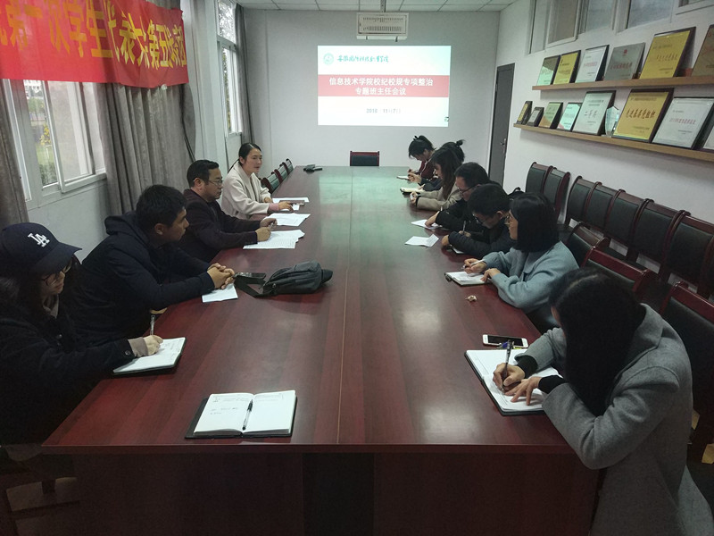 会后,在行政楼304会议室又召开了信息技术学院校纪校规专项整治班主任会议。会议要求:各班要召开主题班会,由班主任组织学生重点学习《beat365唯一官方网站学生违纪处分办法》,并做好记录。同时,各辅导员、班主任要本着认真负责的态度开展摸排工作,对存在属于重点整治内容现象的学生要建档并制定具体教育整改措施。各班主任要结合年级特点对本班学生进行逐个走心谈话,真正走进学生的内心,做好引路人。