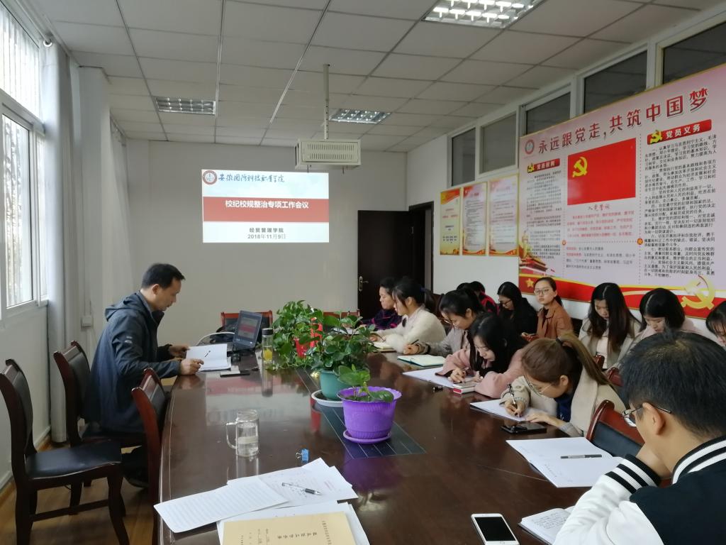本网讯(经贸管理学院 许凤麟)为深入贯彻落实《beat365唯一官方网站校纪校规专项整治活动实施方案》文件精神,进一步增强学院学生的组织纪律观念和安全意识,近日,经贸管理学院组织召开校纪校规专项整治工作会议。会议由副书记刘峰主持,全体班主任参会。
