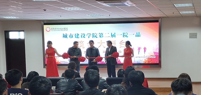 现场由张显国致开幕词,他指出,“筑金”是燕昭王筑黄金台,广招天下贤德之士的典故,用此作为学院文化建设的品牌,不仅表达了城市建设学院希望通过专业文化建设和综合素质培养,为国家社会培养高质量有用之才的美好愿望,而且也契合学院办学特色和学科特点。他希望,筑金大舞台能结合学校的学风建设、校纪校规专项整治活动多做工作,成为端正学风的良好契机;筑金大舞台是文化之台、学术交流之台,弘扬正气,传播正能量,让低俗文化远离我们的大舞台。叶启衡宣读此届筑金大舞台活动的四大篇章,分别是筑金沙龙、筑金赛场、筑金论辩和筑金讲堂。随后朱德明、张显国、叶启衡共同为开幕式剪彩,并宣布开幕,现场气氛也达到高潮。