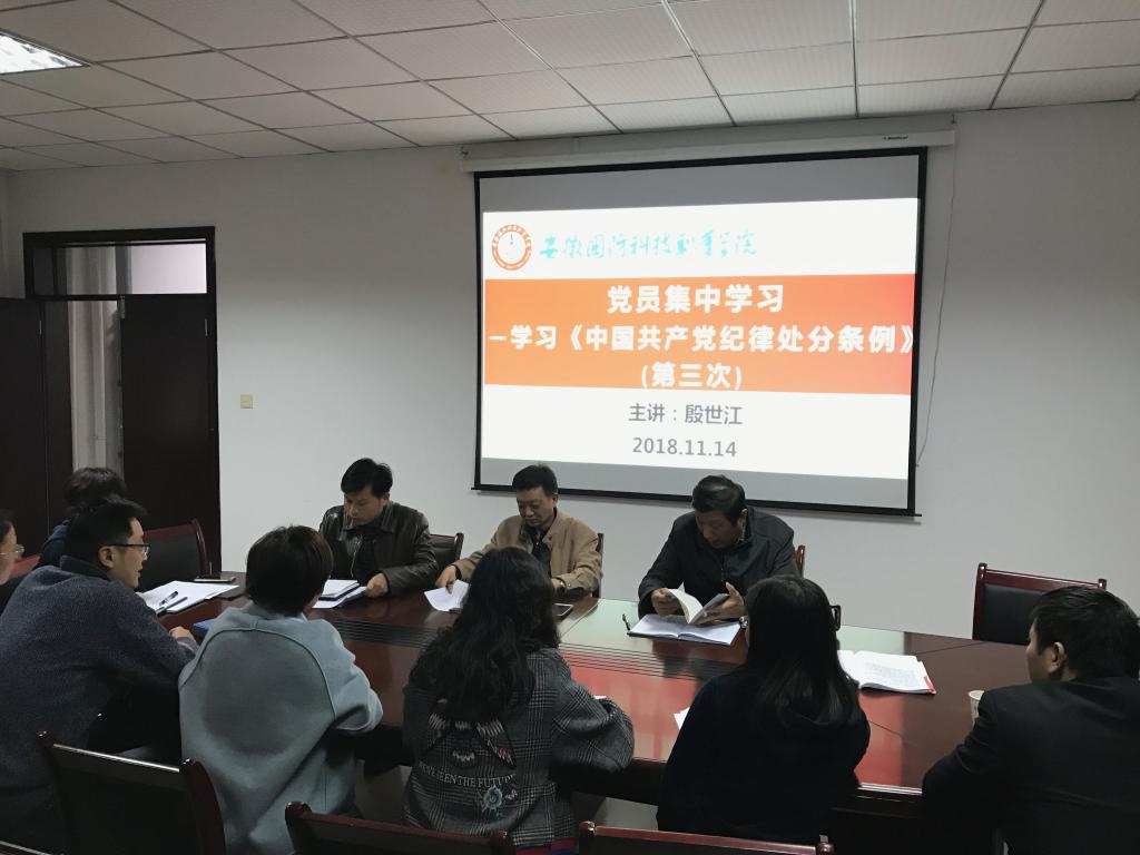 本网讯(汽车技术学院 刘严)为更好地学习宣传、贯彻执行新修订的《中国共产党纪律处分条例》,增强广大教职工党员对新《条例》的认识,按照学校纪委和纪检监察室专题会议的要求,11月14日下午,汽车技术学院党总支开展专题学习教育活动,继续学习2018年新修订的《中国共产党纪律处分条例》,全体党员同志按时参加学习教育活动,会议由余桂刚副书记主持。