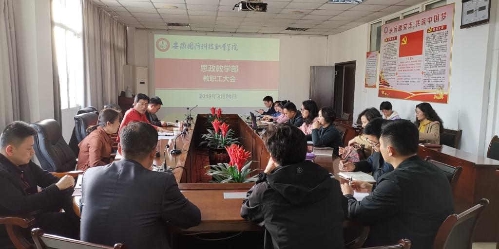 本网讯 3月20日下午,思政教学部在行政楼403会议室召开部门教职工大会,深入学习贯彻习近平总书记在学校思想政治理论课教师座谈会上的重要讲话精神。校党委委员、宣传部长、思政部主任袁旗出席并主持会议。