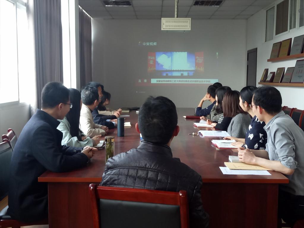 本网讯(信息技术学院 马士君)根据《中共安徽省委教育工委关于组织收看安徽省劳动模范工匠大师进校园活动网络直播的通知》文件精神,按照学校统一安排部署,4月3日下午3:30,信息技术学院组织全体党员教职工和学生入党积极分子在行政楼304会议室集中观看《安徽省劳动模范工匠大师进校园活动走进安徽职业技术学院》。