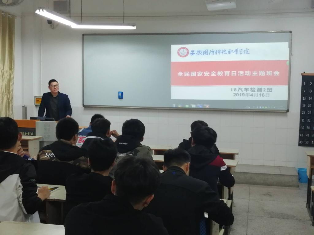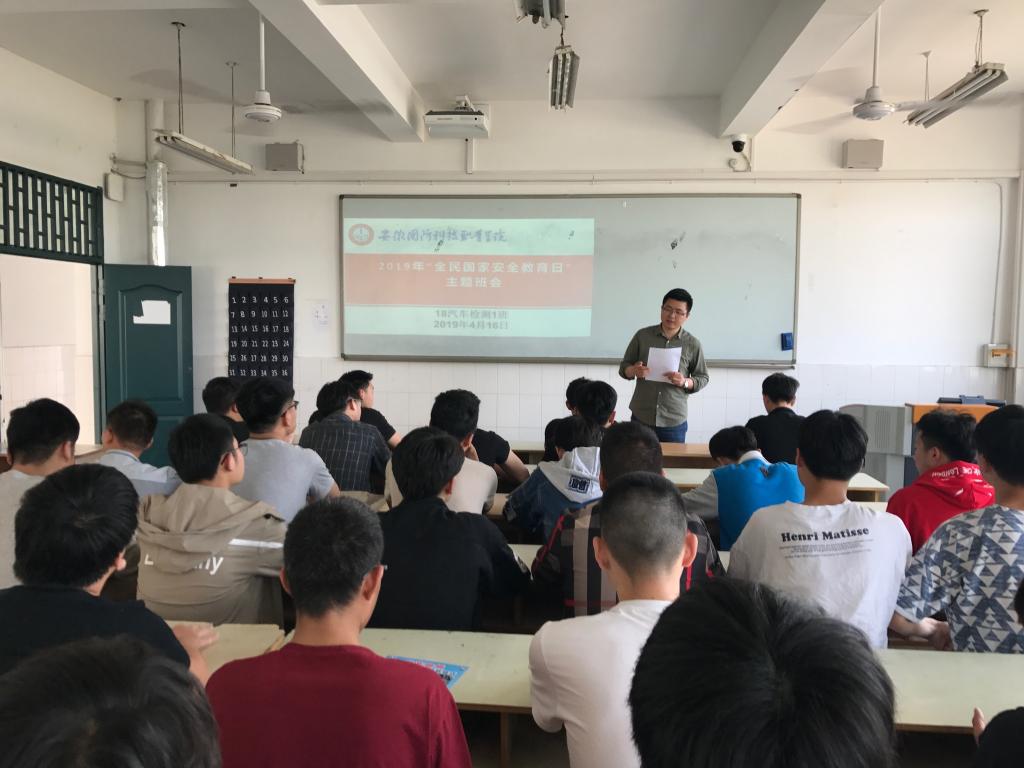 本网讯(汽车技术学院 朱其阳)今年4月15日是我国第四个全民国家安全教育日,为深入学习贯彻习近平新时代中国特色社会主义思想,进一步增强广大师生国家安全意识,筑牢校园安全防线,按照学校《关于开展2019年“全民国家安全教育日”活动的通知》文件精神,4月12日—4月17日,汽车技术学院组织在各班级开展“全民国家安全法治”宣传教育活动。