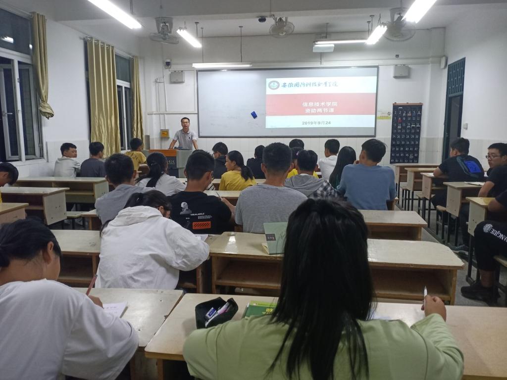本网讯 为切实做好学生资助政策宣传和解读工作,使广大学生知晓并了解学生资助政策,根据《关于做好学校2019/2020学年国家奖助学金推荐评审工作的通知》文件精神,信息技术学院于9月24日晚上六点半在第二教学楼202教室开展学生资助政策宣讲“两节课”活动。宣讲活动由院资助辅导员主持,19级新生参加。
