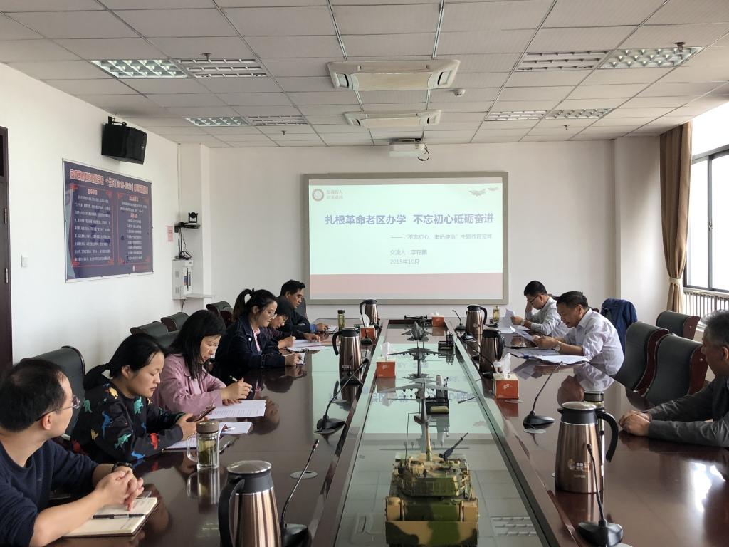 本网讯 10月23日下午,一支部组织开展“不忘初心、牢记使命”主题教育党课。校党委委员李存鹏作题为《扎根革命老区办学,不忘初心砥砺奋进》专题党课报告。支部书记吴方庭主持会议,支部全体党员参加了会议。