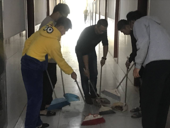 教师党员们佩戴党徽,手执清洁工具,捋起袖子,分工清扫学院6栋学生宿舍楼的走廊、楼梯等公共区域卫生。当天下午是学生宿舍卫生检查时间,教师党员们以高度认真负责的精神仔细清扫地面垃圾及卫生死角,同时提醒宿舍学生积极打扫宿舍卫生,自觉维护公共环境卫生,为学生起到了榜样示范作用,学生们纷纷投入到清扫、处理宿舍垃圾的队伍中。