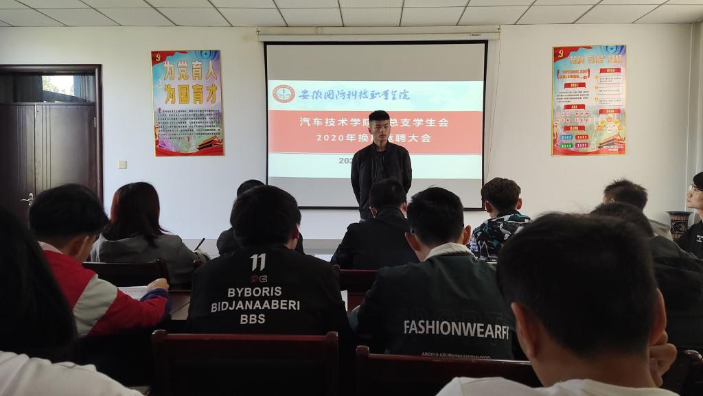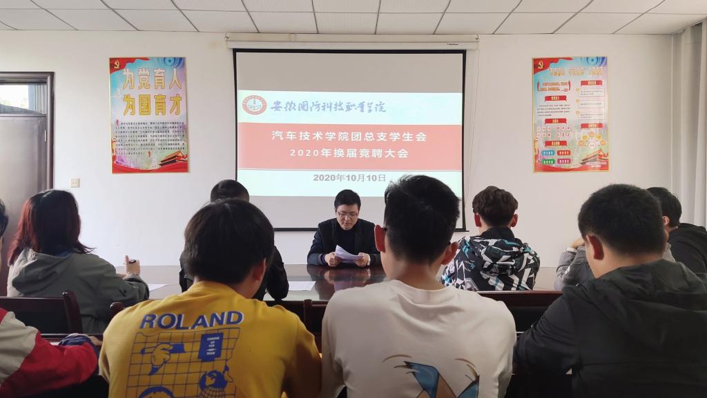 本网讯(汽车技术学院 朱其阳)为深入贯彻上级关于从严治团的指示精神,推动团学工作的科学化和规范化,服务大学生全面发展成长成才,根据校团委《关于做好2020年度学生团体换届工作的通知》精神,汽车技术学院团总支学生会于10月10日中午12:00在行政楼416会议室隆重举办2020年学生干部换届竞聘大会。汽车技术学院团总支负责人朱其阳老师和第七届学生会主席团成员应邀出席并担任本次竞聘大会的评委,会议由团总支副书记孙方祥同学主持。
