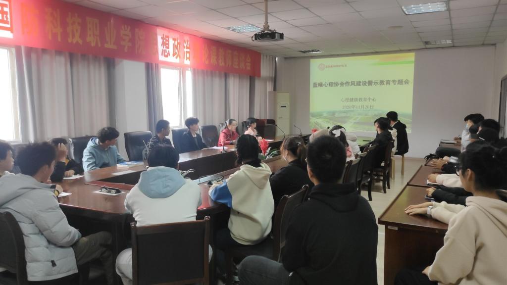 本网讯(蓝曦心理协会 许昌尧)按照校团委要求,蓝曦心理协会于11月20日中午在知行楼403会议室召开作风建设警示教育专题会,蓝曦心理协会指导老师张丽、会长尹宇翔、副会长季苏皖及各部门负责人和成员参加了会议。