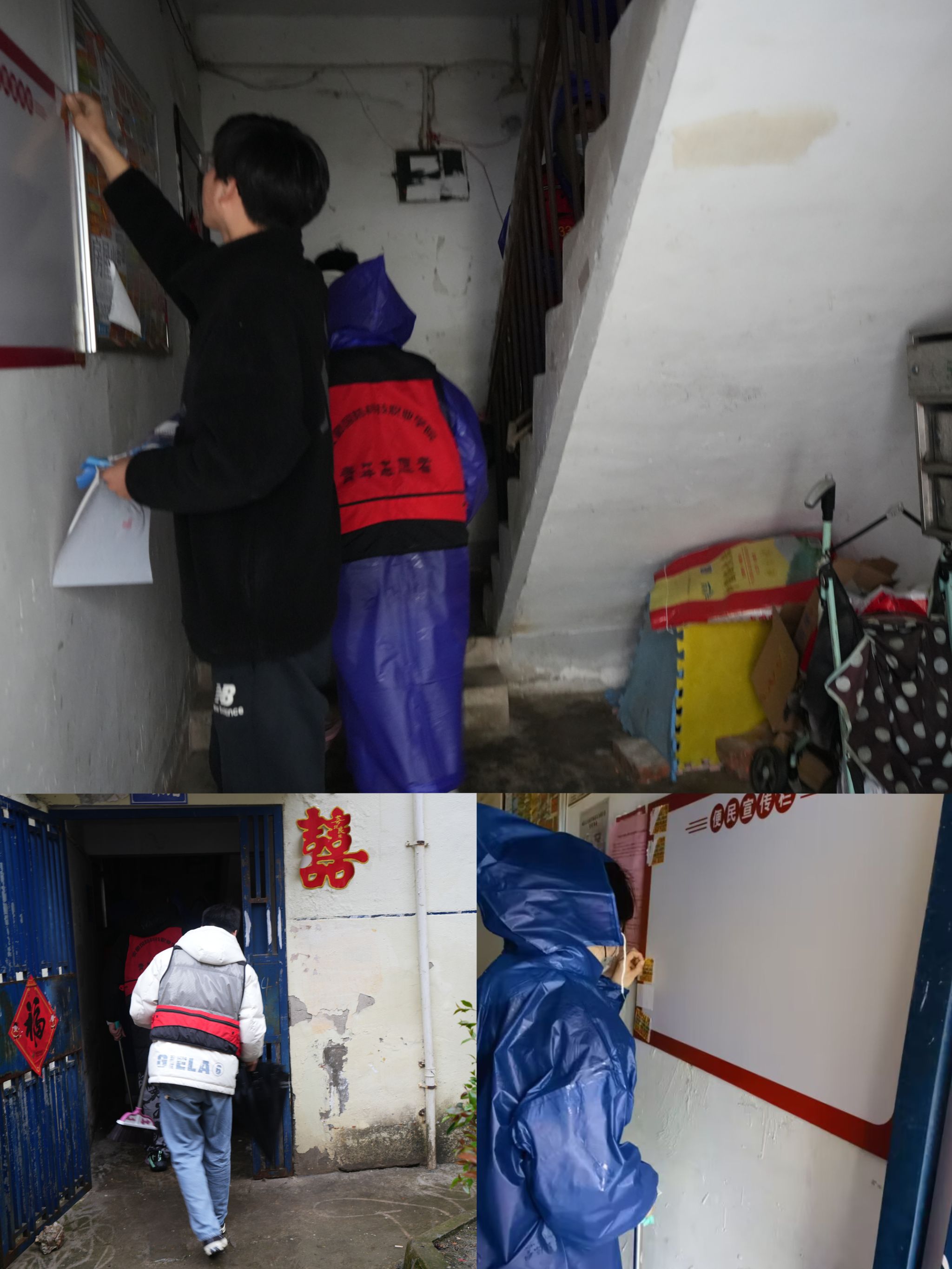 此次志愿者活动主要以美化城市环境为主要内容,同学们在社区工作人员的引导下,冒着小雨来到了位于城区的大别山新村。同学们拿着清洁工具在小区里面挨个楼栋逐层进行垃圾清扫,对于楼栋里面张贴的陈旧宣传画、积在楼梯口和牛奶箱里面的垃圾,同学们仔细地一点点清除。活动中,同学们看到了部分楼栋还存在“乱拉电线”的现象,大家认识到这是存在安全隐患的,在老师和社区工作人员的指引下,帮忙清除。
