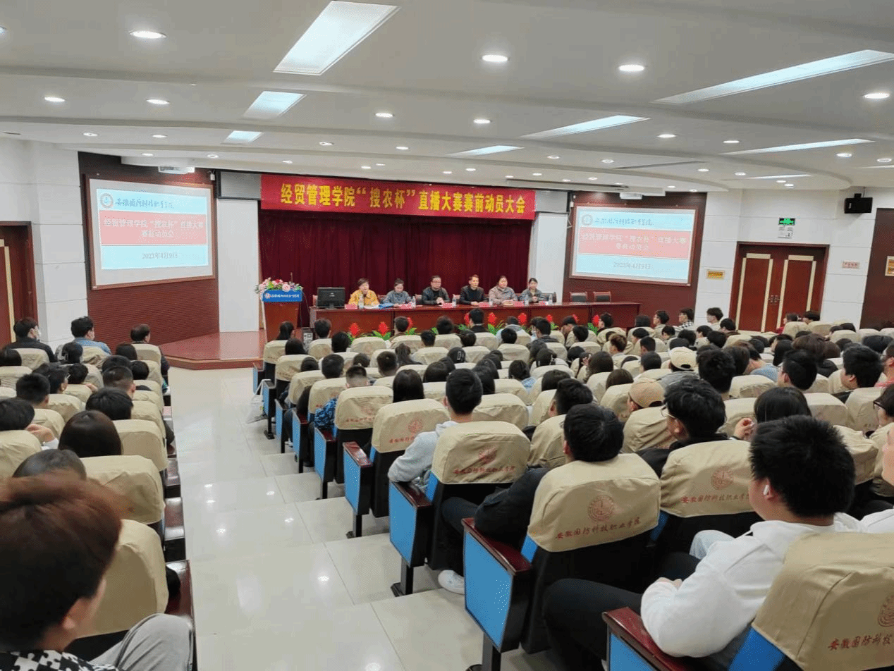 本网讯 为促进大学生的理论学习与社会实践紧密结合,提升大学生创新创业能力,4月9日晚,经贸管理学院于图书馆报告厅开展“搜农杯”直播大赛动员大会,安徽搜农农业发展有限公司总经理汪长远、学院副院长杨学分、团总支书记许凤麟及协会指导老师出席会议。