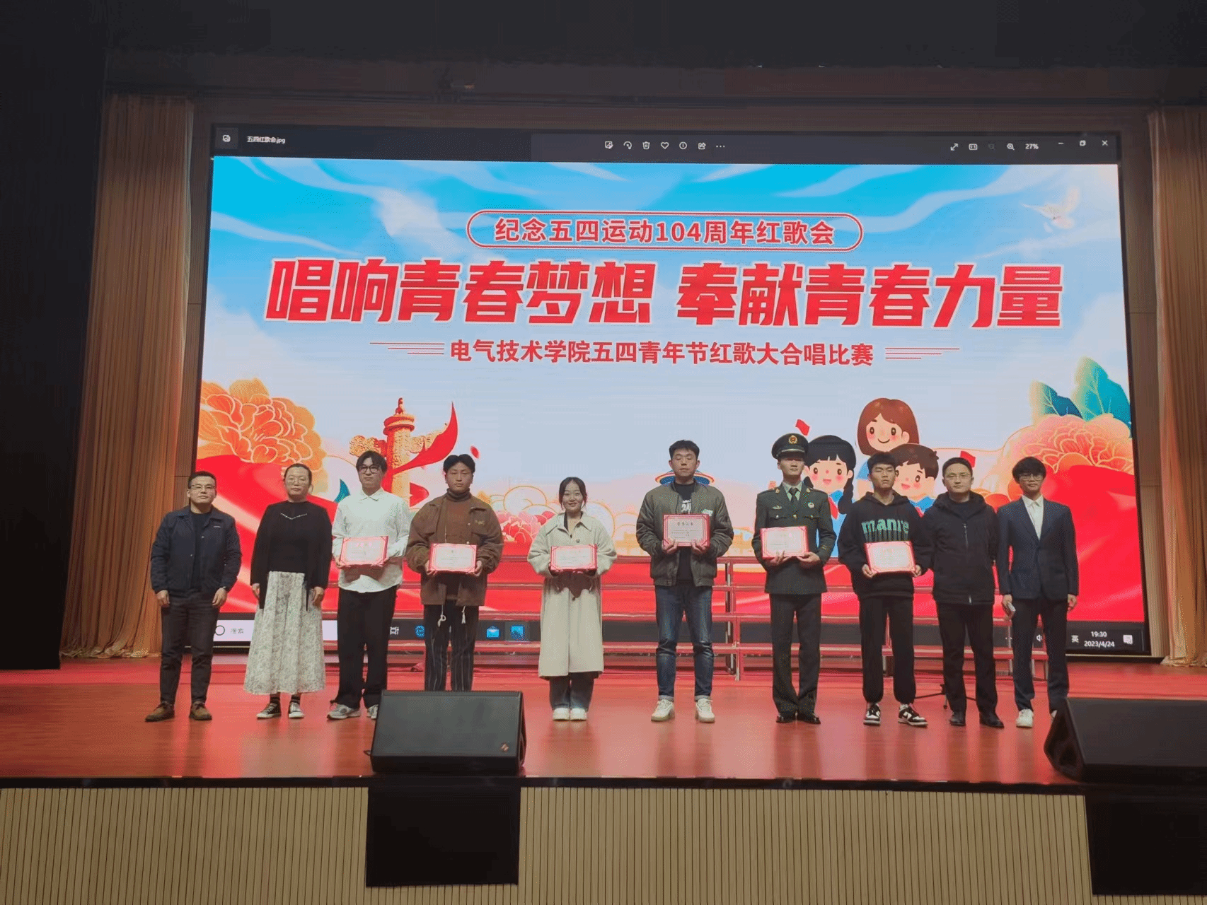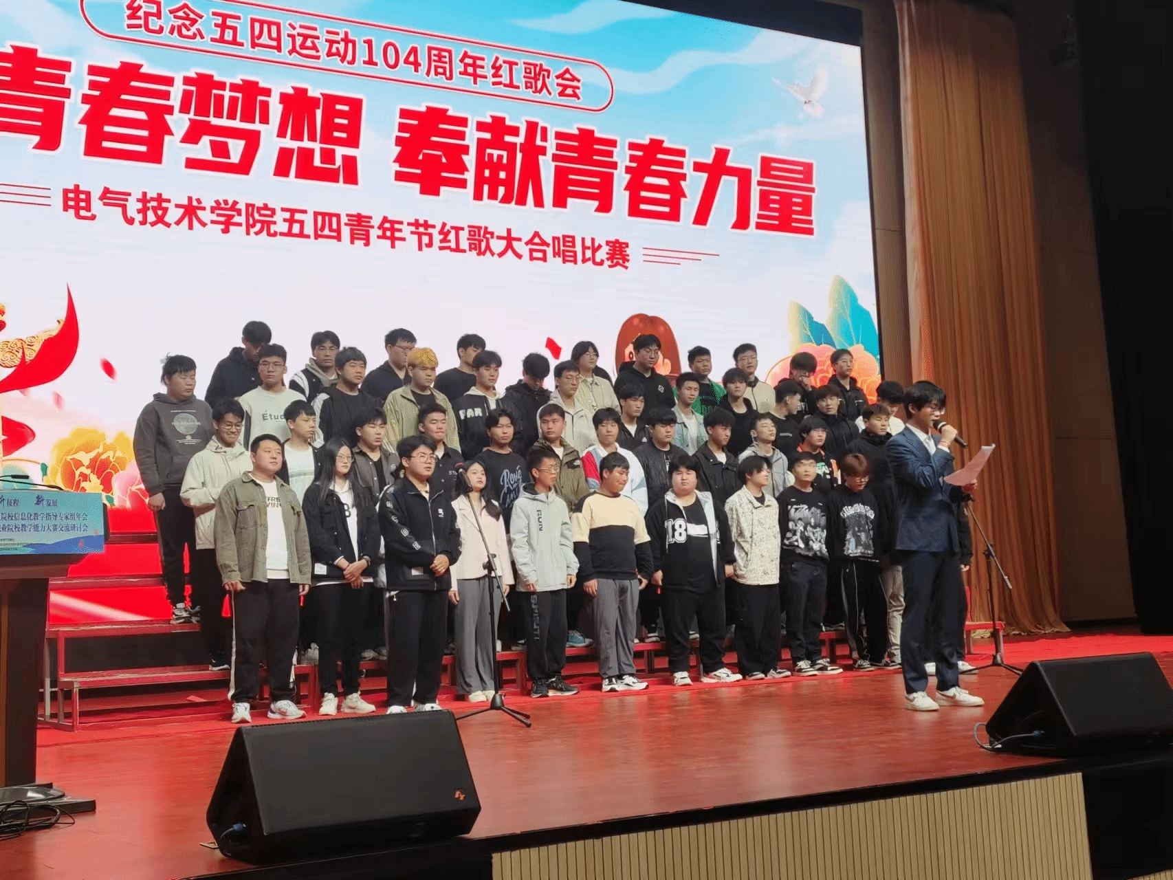 本网讯(电气技术学院 陈俊)为深入学习贯彻党的二十大精神,团结带领广大团员青年弘扬“爱国、进步、民主、科学”的五四精神,培养大学生强烈的爱国情感,展现积极向上的精神风貌,营造良好的校园文化氛围,4月24日晚,电气技术学院在学校产教融合中心大学生活动中心多功能厅举行了五四青年节红歌大合唱比赛。电气技术学院团总支书记陈俊、22物联网1班班主任樊新丽、22集成电路1班班主任马骙、22机电3班班主任孙洋洋和全体2022级参赛班级学生参加了此次活动。