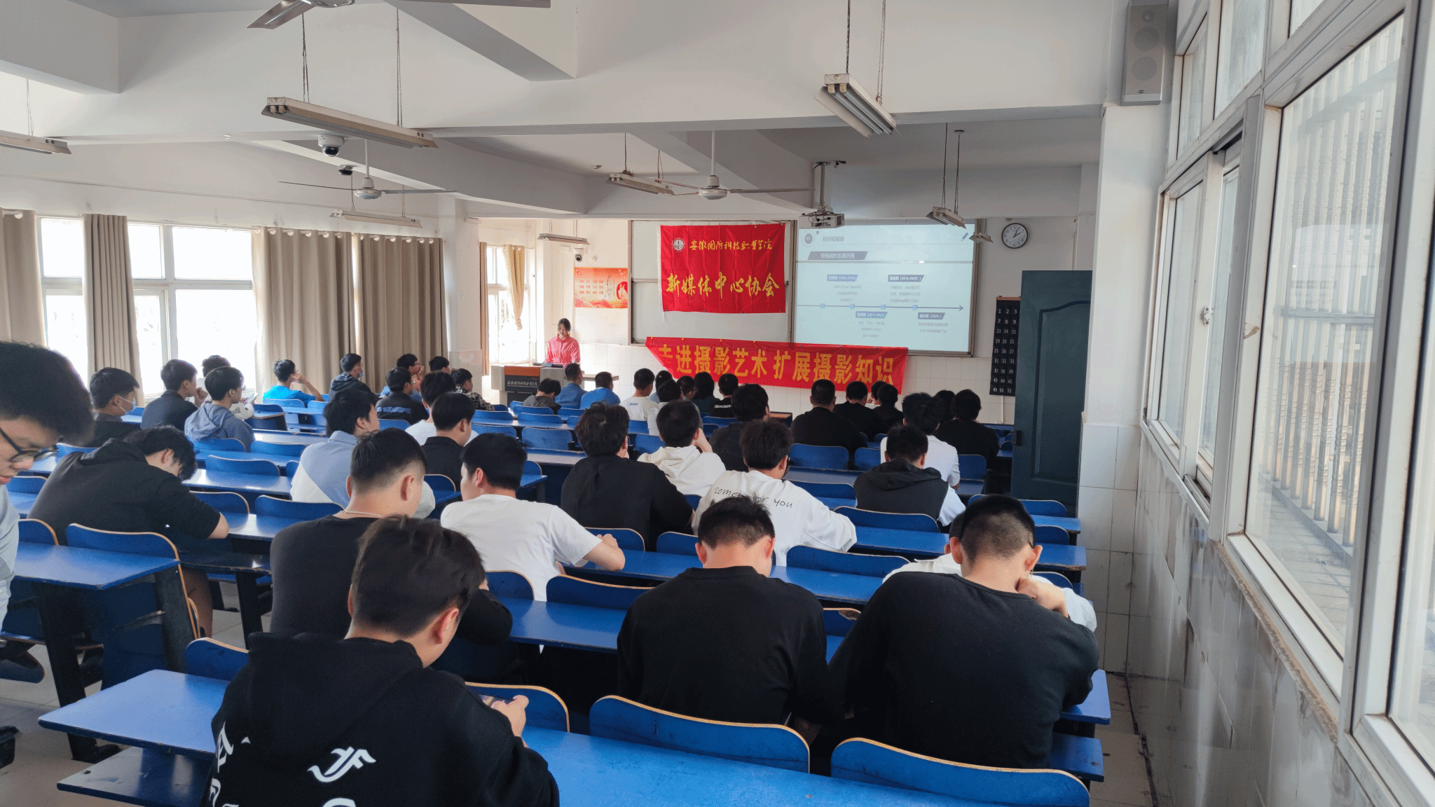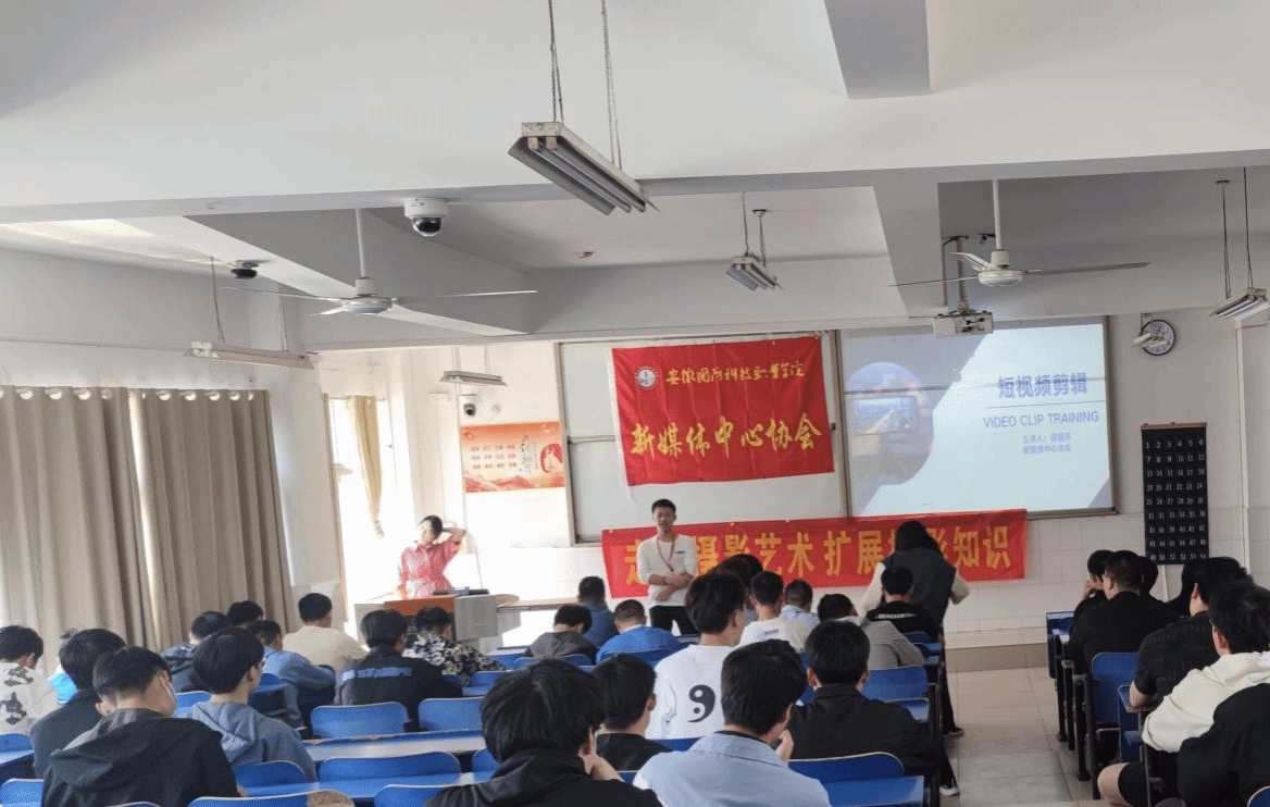 本网讯 为了提高学生们的摄影技术和视频剪辑技巧,5月7日,由新媒体中心协会举办的“沁湖光影摄影讲座”主题活动在二教105举办。本次讲座由新媒体中心协会会长叶丙武主持,短视频部部长储道萍和摄影部部长董俊康出席了本次会议。