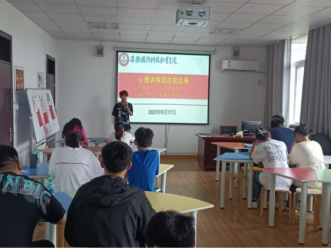 本网讯 为了选拔优秀的同学承担心理健康教育中心讲解任务,5月17日下午,蓝曦心理协会在知行楼五楼团体训练室举行心理讲解员选拔比赛。比赛由心理健康教育中心主任戴柳、协会指导老师费思佳以及协会部长作为评委,蓝曦心理协会副会长王铭锟主持。
