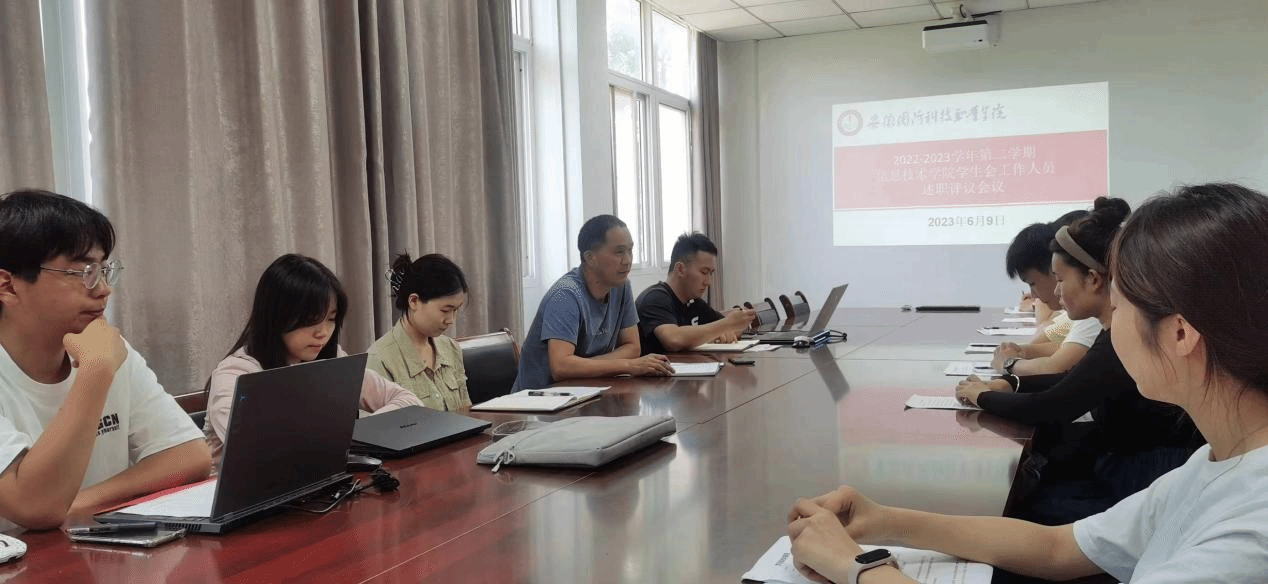 本网讯(信息技术学院 学生会)为进一步加强学生干部队伍建设,充分发挥学生干部的积极性与主动性,有效衡量学生会工作成效和作风建设,全面准确的掌握学生干部的工作情况。6月9日上午,信息技术学院于知行楼304会议室召开2022-2023学年第二学期学生会工作人员述职评议会。学院组织员吴伟,团总支书记孙颖凯、辅导员薛蕊、学院轮值主席团成员、各部门负责人以及学生代表出席会议。会议由团总支书记孙颖凯主持。