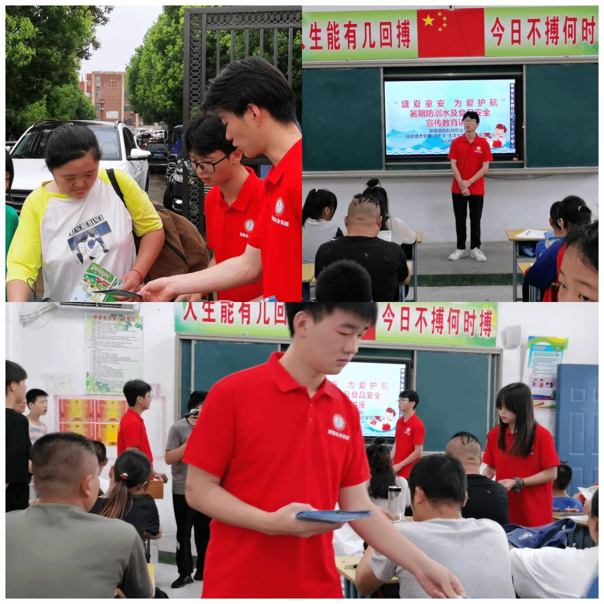活动中,信息技术学院暑期社会实践团队先后前往皖西育才学校和六安市金安区三十铺镇太平村,由团队的成员们为皖西育才学校和三十铺太平村的学生和家长们开展了主题为“盛夏童安 为爱护航”的暑期防溺水及食品安全宣传教育讲座,讲座结束后,同学们向前来参加讲座以及校园内的学生和家长发放宣传册,并耐心解答学生和家长提出的问题。