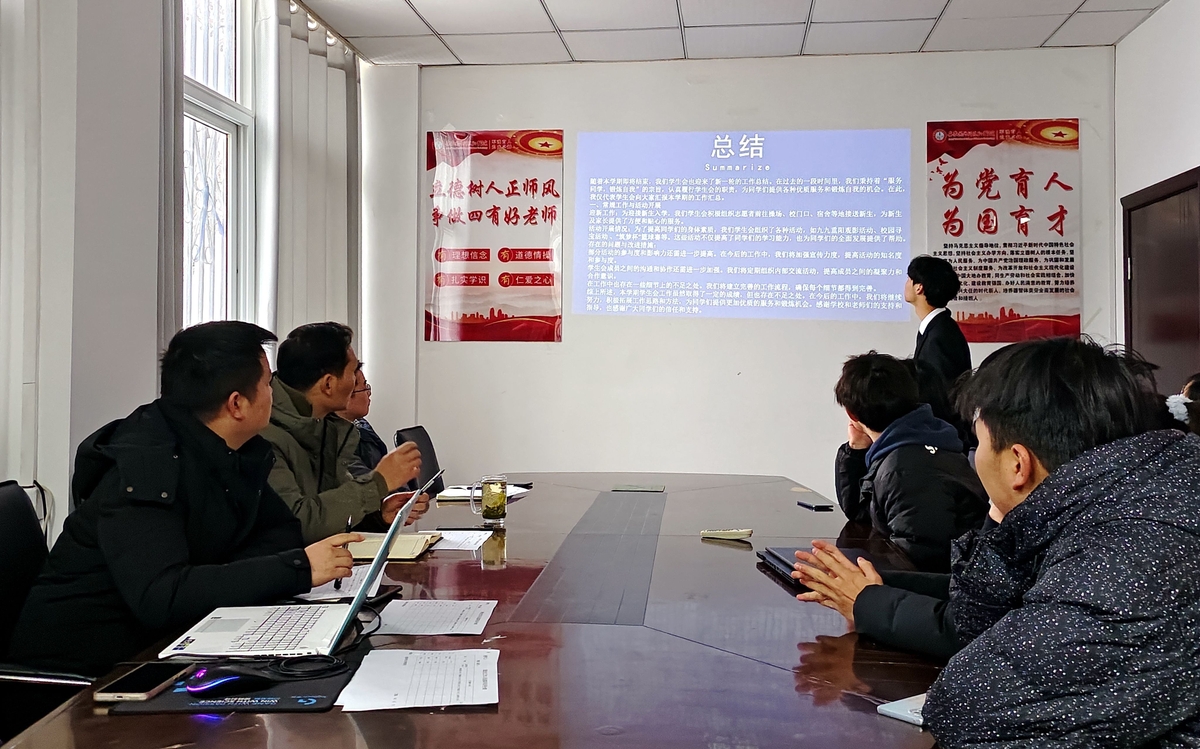 会上,学院团总支学生兼职副书记、学生会主席团和各部门负责人从政治态度、道德品行、学习情况、工作成效、纪律作风五个方面向与会的老师、同学们进行全方位的述职,并在总结和反思本学期工作的同时,就下一学期的工作规划在会议上进行了汇报。
