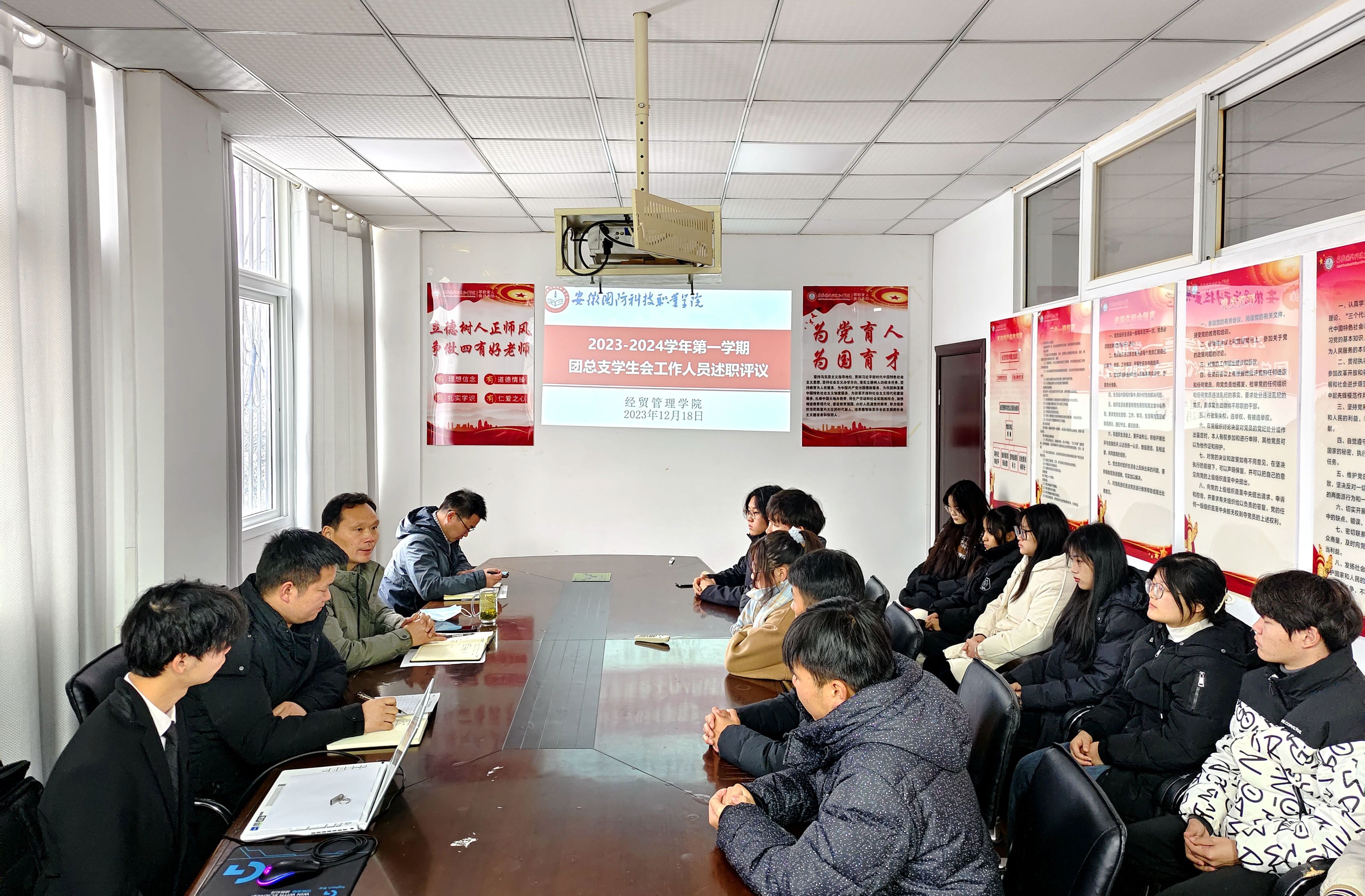 本网讯(学生通讯员 余宏存)为进一步加强学院团总支学生会组织建设,规范团总支学生会工作,切实发挥学生组织在学校学生管理中的重要作用,根据校团委工作要求,12月18日中午,经贸管理学院于知行楼202会议室组织召开了院团总支学生会2023—2024学年第一学期述职评议会。经贸管理学院党总支书记刘峰、辅导员陈龙老师、团总支学生会主要工作人员以及学生代表参加了此次会议,会议由学院团总支负责人陈玮老师主持。