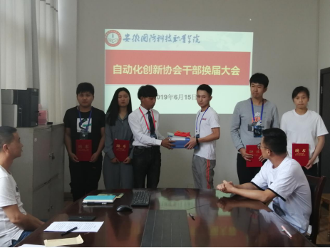 本网讯 为了调动自动化创新协会新一届干部的积极性,培养新一届干部的责任心和组织能力,2019年6月14日下午,自动化创新协会在行政楼106会议室举办了第九届换届大会,出席本次大会的有自动化创新协会指导老师江治国、院团总支老师王腾州以及团总支副书记谢圣鑫和自动化创新协会的17、18级会员。