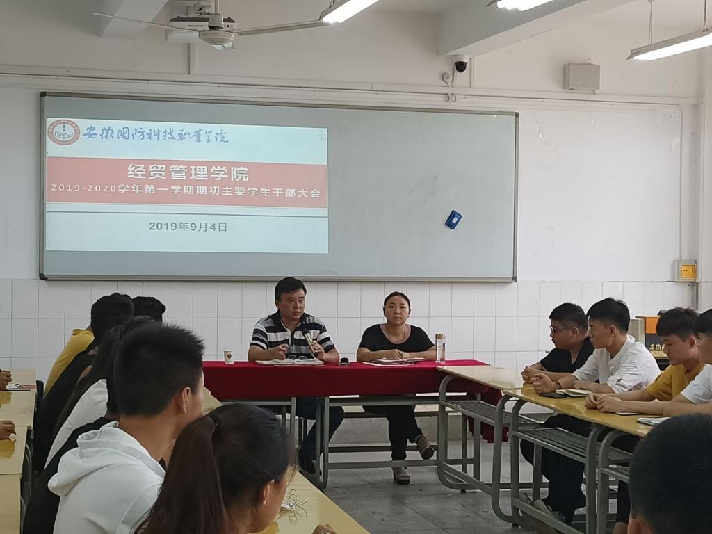 本网讯(经贸管理学院 付玉梅)为推动新学期学生管理工作有序平稳开展,经贸管理学院于9月4日下午在2教106举行2019-2020学年第一学期期初主要学生干部大会。学院党总支书记杜先扬出席会议,团总支学生会主要学生干部、各班主要学生干部、院属社团学生负责人等共40余人参会,会议由团总支书记付玉梅主持。