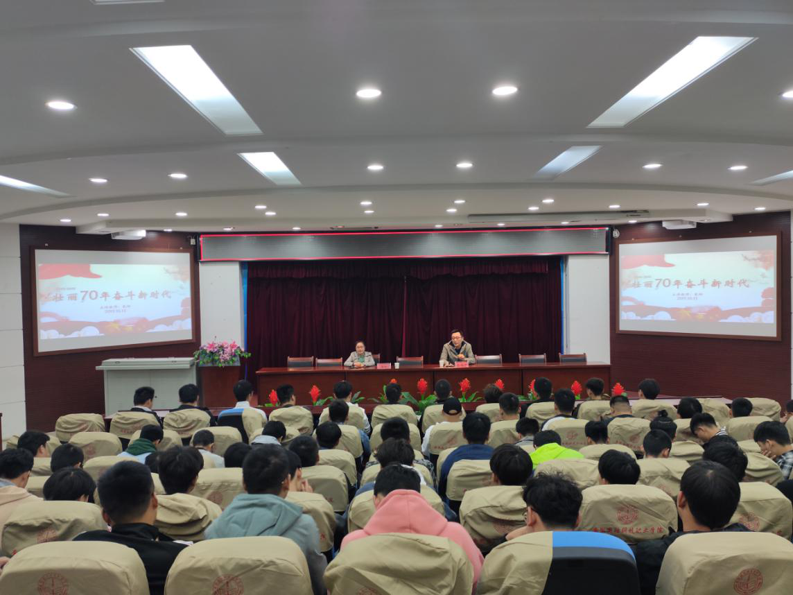 本网讯(汽车技术学院 黄世超)为践行社会主义核心价值观,弘扬伟大的抗战精神,展示新中国成立70年来取得的伟大成就,进一步强化新时代青年的爱国精神,10月15日傍晚,汽车技术学院在图书馆报告厅开展了“壮丽70年·奋斗新时代”形势与政策专题讲座。本次讲座由余桂刚副书记主持,戴柳老师担任主讲人。汽车技术学院18级全体同学认真聆听了讲座。