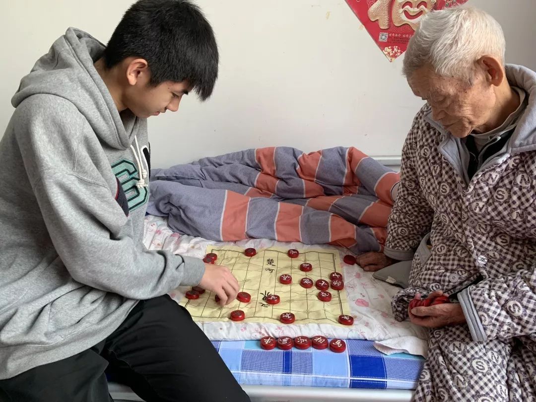 志愿者陪老人下象棋,一位抗战英雄吸引了很多志愿者,爷爷很用心地给他们讲参战的经历,志愿者们听得津津有味,同时也为这样一位“护国英雄”感到无比自豪。看着老人们脸上露出的笑容,每个人都觉得心里暖暖的。
