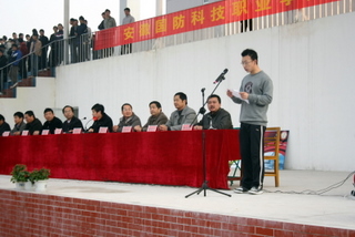 管理系邓士霄同学、体育教师张凤分别代表参加第五届运动会的运动员、裁判员庄严宣誓。