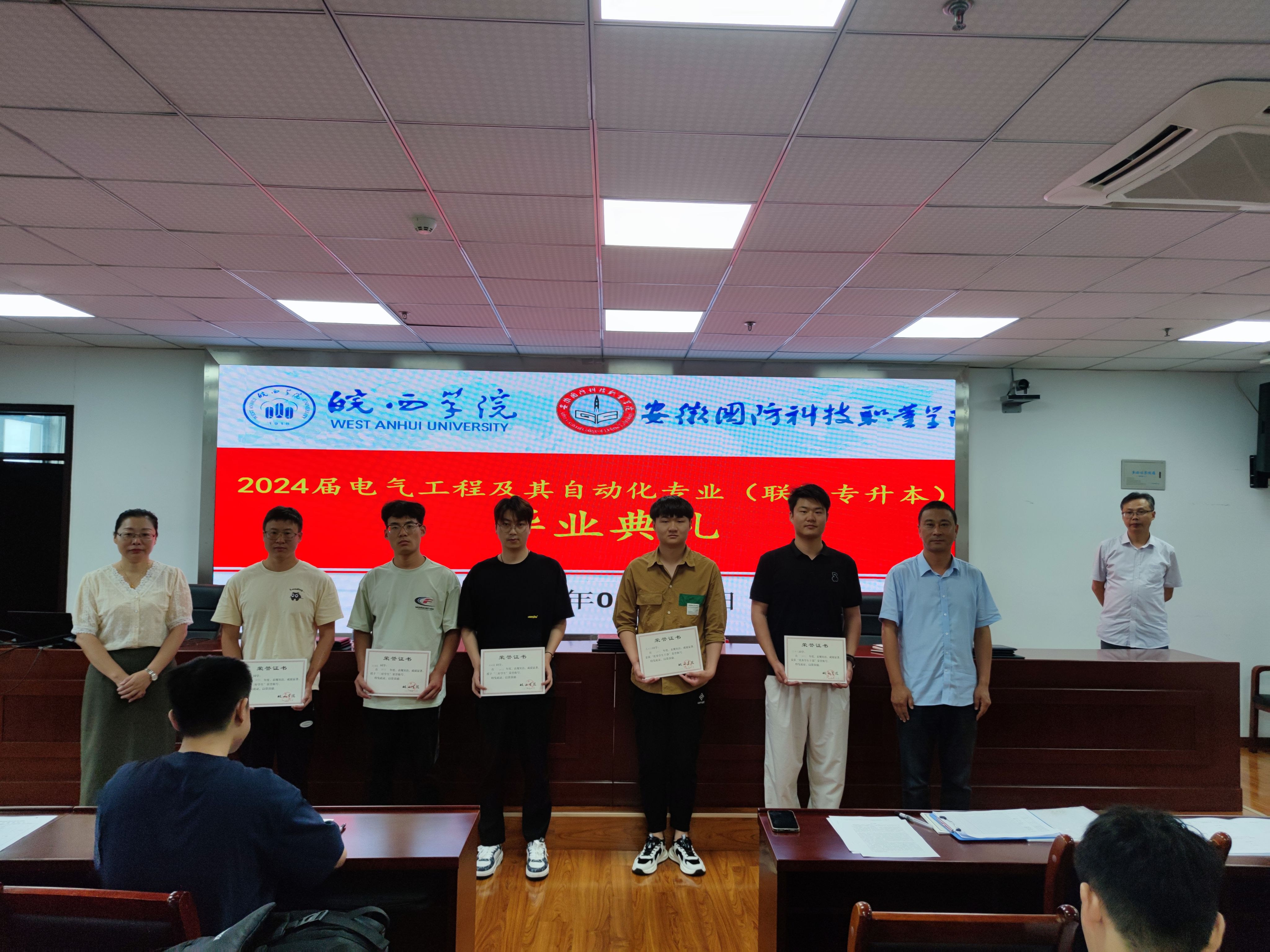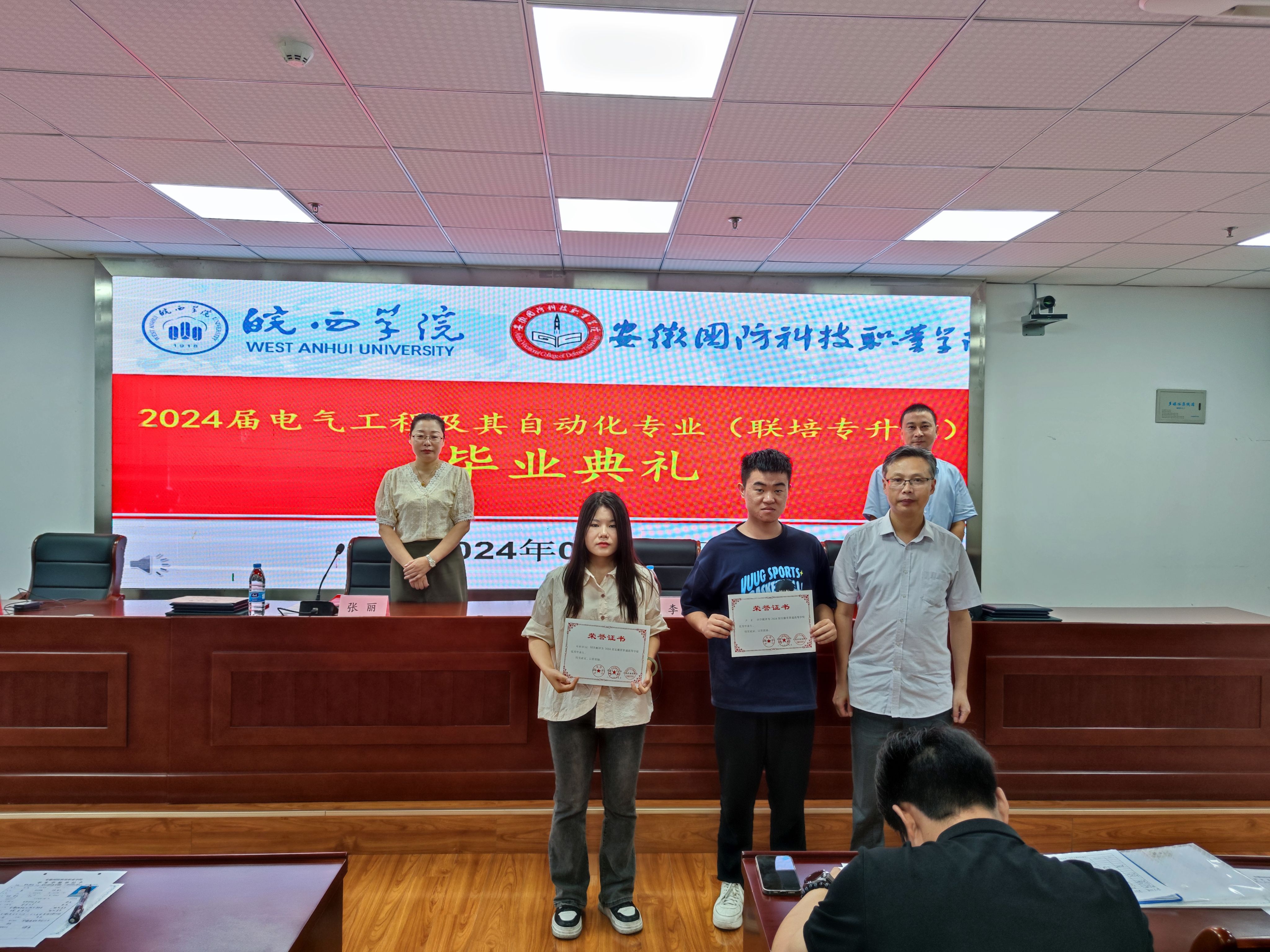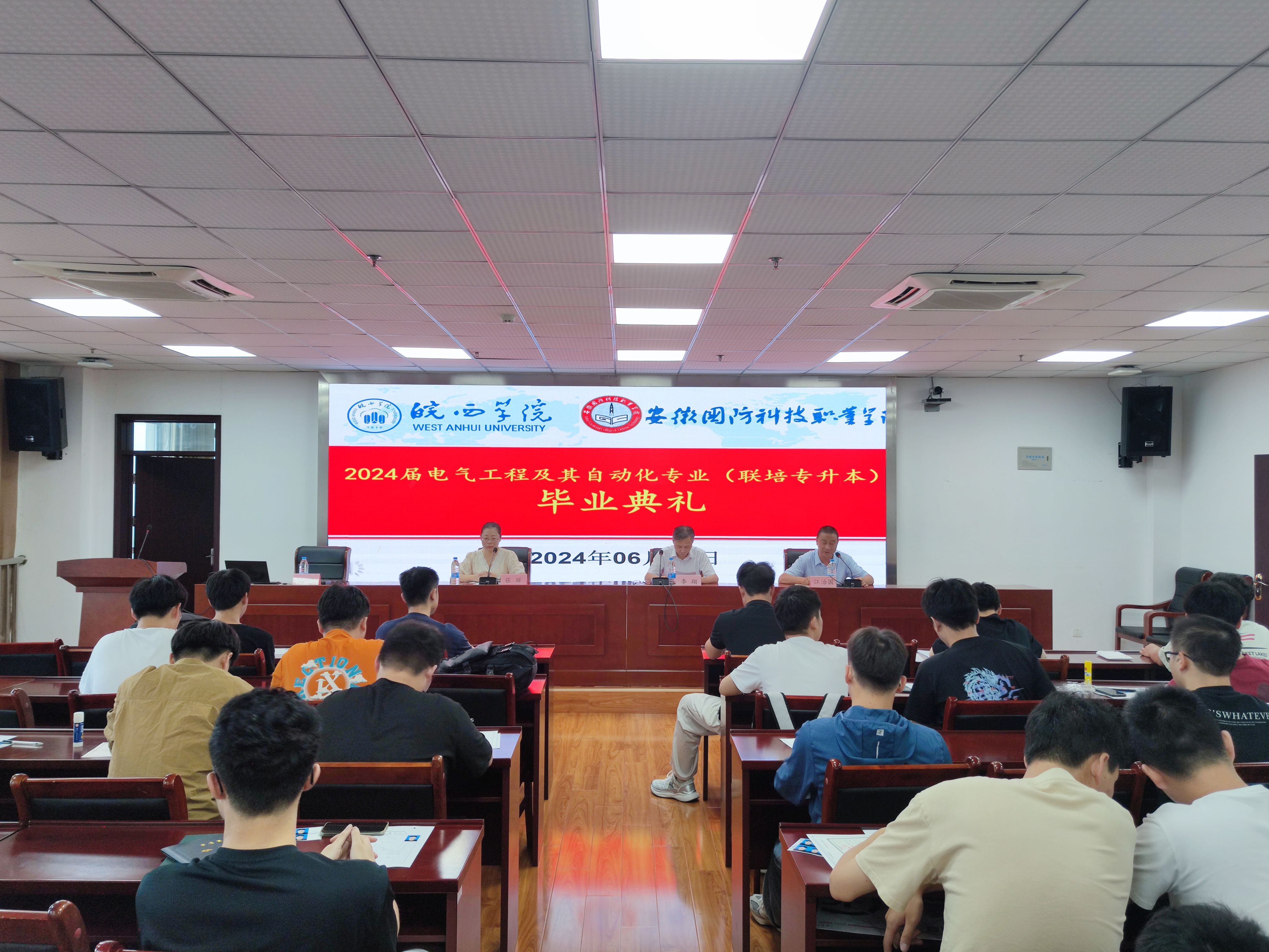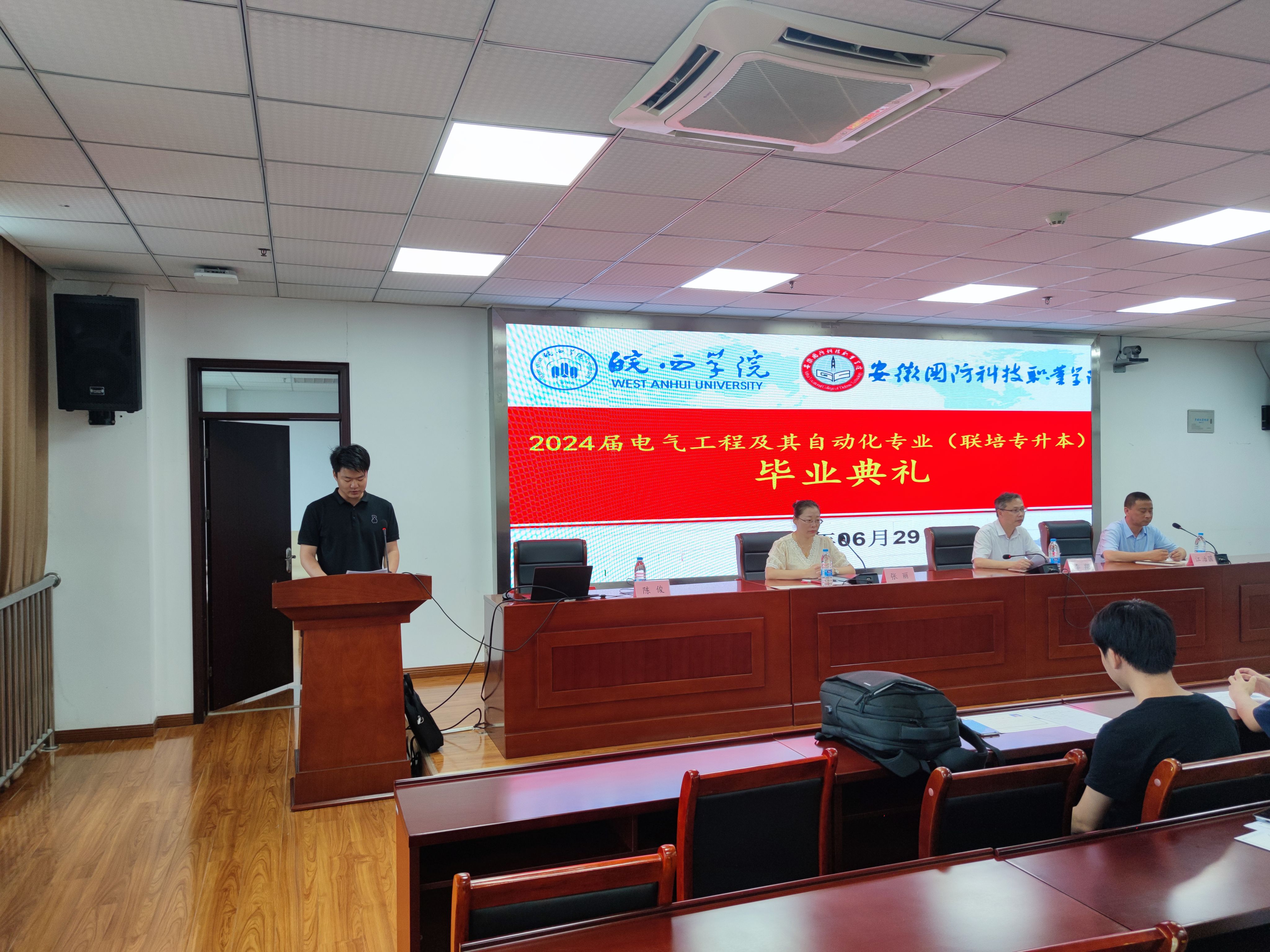 本网讯 2024年6月29日上午,皖西学院与beat365唯一官方网站专升本联合培养电气自动化技术专业 2024 届毕业生毕业典礼在秉心楼12楼会议室隆重举行。电气技术学院领导、教师以及全体 2024 届电气自动化技术专升本毕业生共同见证了这一重要时刻,会议由电气技术学院副院长江治国主持。
